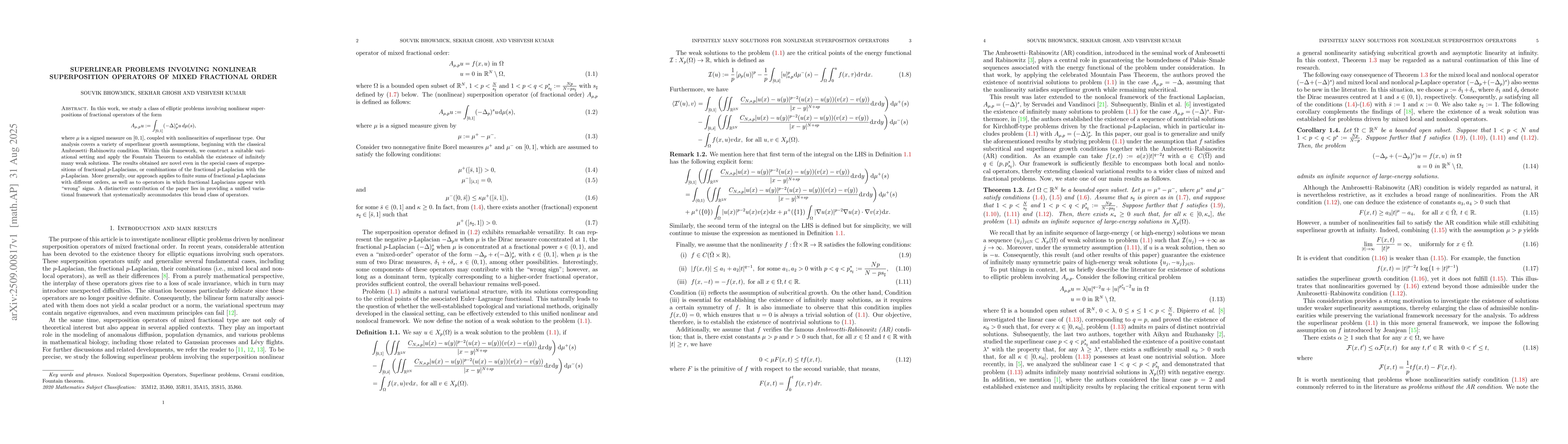 In this work, we study a class of elliptic problems involving nonlinear superpositions of fractional operators of the form \[ A_{\mu,p}u := \int_{[0,1]} (-\Delta)_{p}^{s} u \, d\mu(s), \] where $\mu$ is a signed measure on $[0,1]$, coupled with nonlinearities of superlinear type. Our analysis covers a variety of superlinear growth assumptions, beginning with the classical Ambrosetti--Rabinowitz condition. Within this framework, we construct a suitable variational setting and apply the Fountain Theorem to establish the existence of infinitely many weak solutions. The results obtained are novel even in the special cases of superpositions of fractional $p$-Laplacians, or combinations of the fractional $p$-Laplacian with the $p$-Laplacian. More generally, our approach applies to finite sums of fractional $p$-Laplacians with different orders, as well as to operators in which fractional Laplacians appear with ``wrong'' signs. A distinctive contribution of the paper lies in providing a unified variational framework that systematically accommodates this broad class of operators.