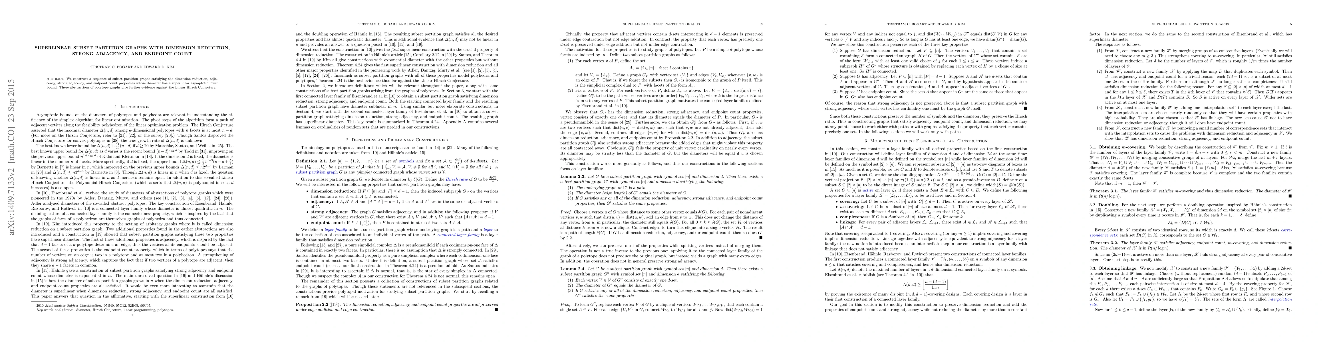 Summary: This paper constructs a sequence of subset partition graphs that demonstrate superlinear diameter growth, supporting evidence against the Linear Hirsch Conjecture, while satisfying dimension reduction, adjacency, strong adjacency, and endpoint count properties.