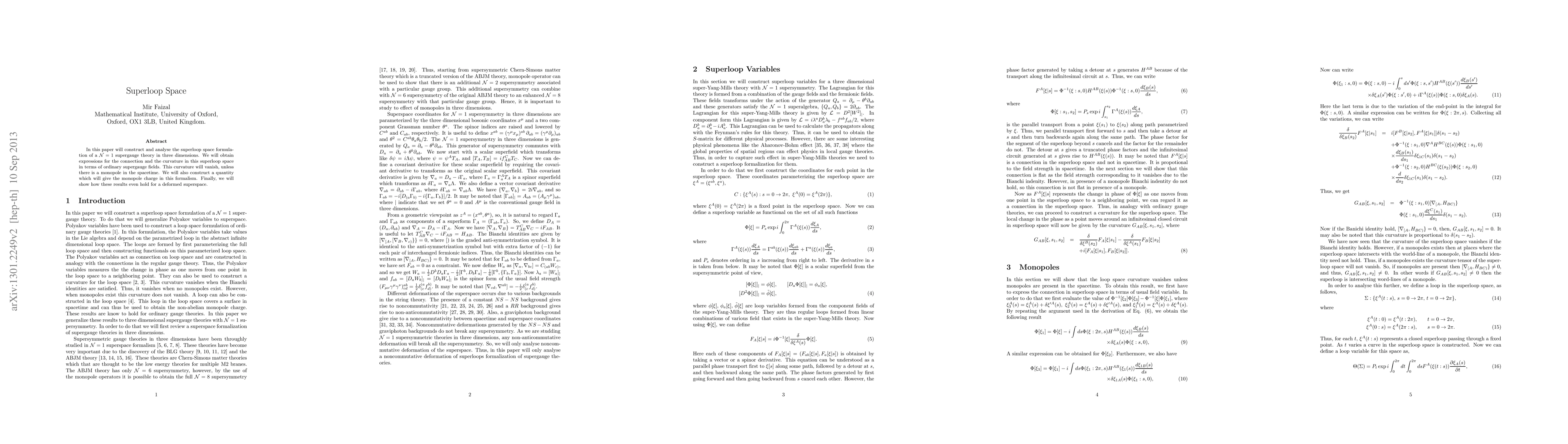 This paper constructs and analyzes a superloop space formulation of $\mathcal{N} = 1$ supergauge theory in three dimensions, deriving expressions for connection and curvature in terms of ordinary supergauge fields, and demonstrating that curvature vanishes without a monopole. It also introduces a monopole charge quantity and verifies these results in a deformed superspace.