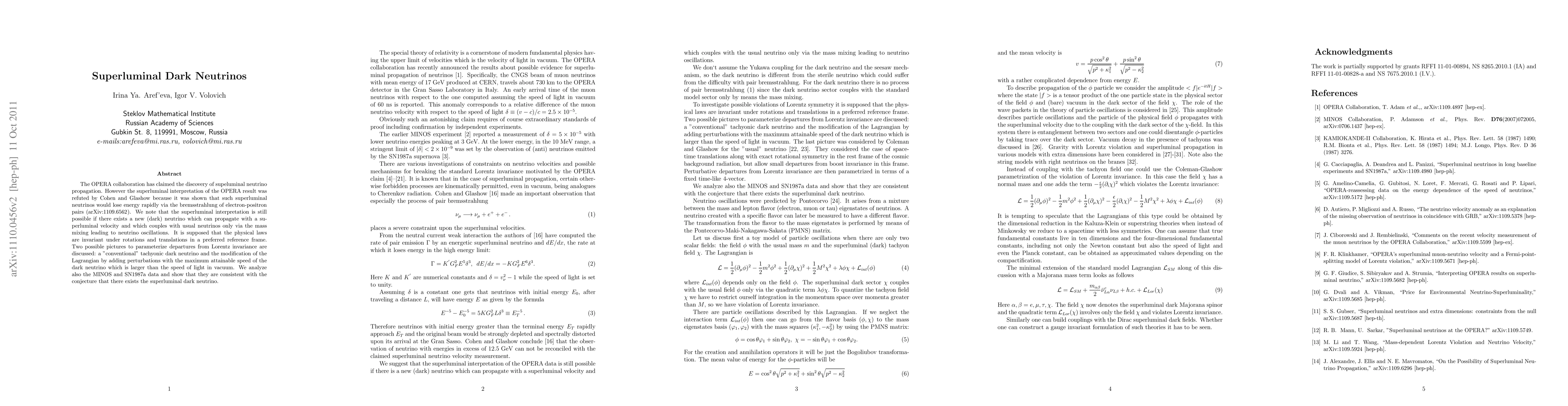 The OPERA collaboration's claim of superluminal neutrino speeds was refuted due to energy loss concerns, but the possibility of a superluminal "dark neutrino" that interacts only via mass mixing remains. Two models for Lorentz invariance violations are proposed, and data from MINOS and SN1987a support the existence of such a dark neutrino.