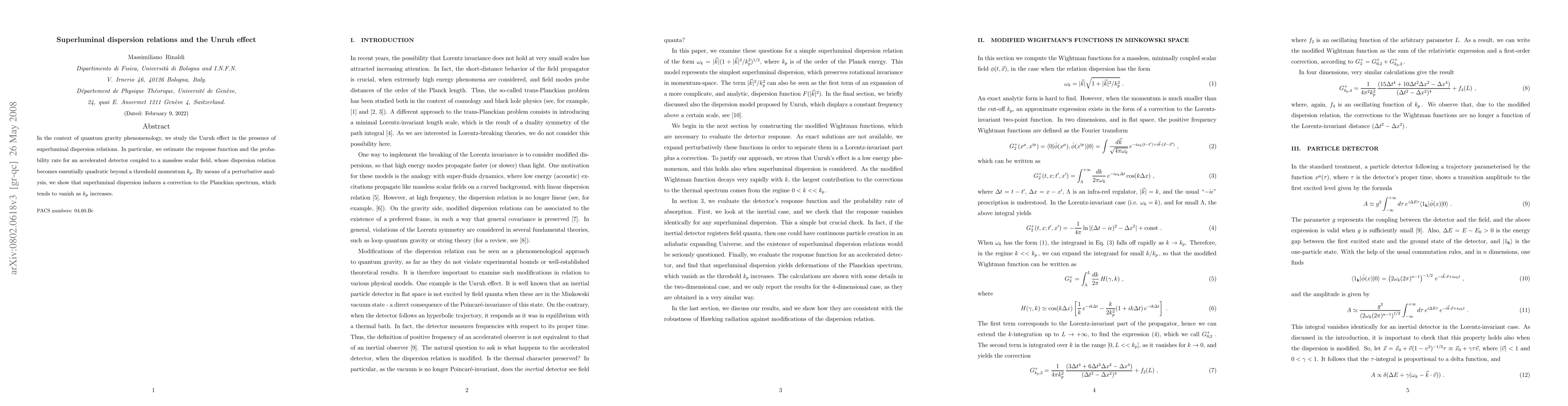 This paper investigates the Unruh effect under superluminal dispersion relations, finding that such relations modify the Planckian spectrum of a massless scalar field, with the effect diminishing as the threshold momentum increases. Perturbative analysis reveals the induced correction to the response function and the probability rate for an accelerated detector.
