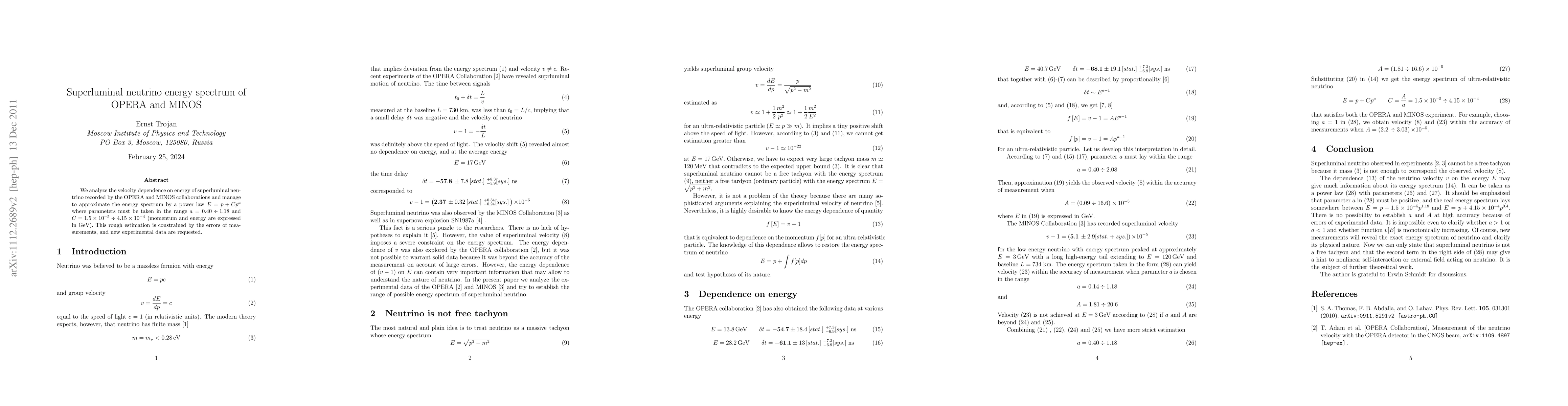 The paper investigates the energy-dependent superluminal velocity of neutrinos recorded by OPERA and MINOS, approximating the energy spectrum as a power law E=p+Cp^a with parameters a in the range 0.40-1.18 and C in the range 1.5x10^{-5}--4.15x10^{-4}. Further experimental data is needed to refine these estimates.