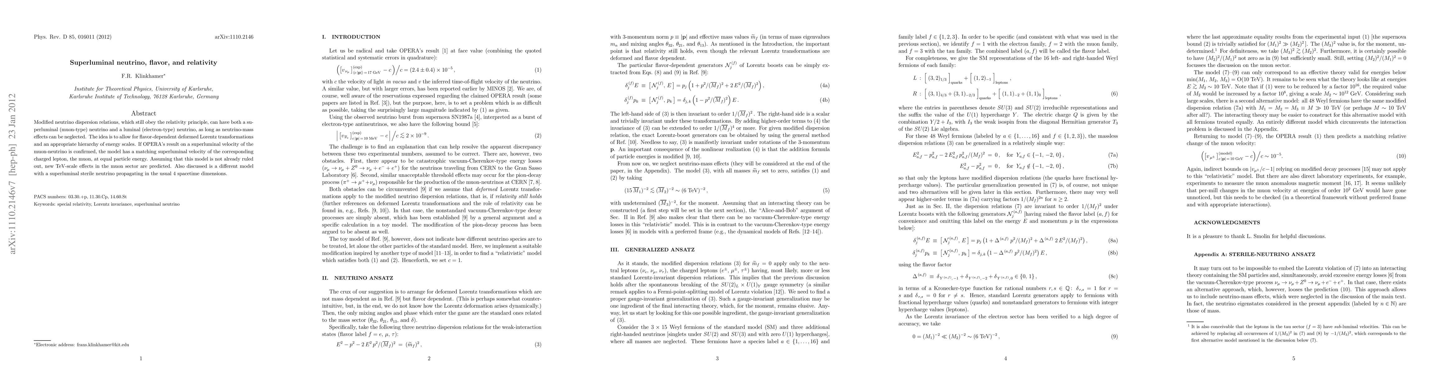 Modified neutrino dispersion relations, which still obey the relativity principle, can have both a superluminal (muon-type) neutrino and a luminal (electron-type) neutrino, as long as neutrino-mass effects can be neglected. The idea is to allow for flavor-dependent deformed Lorentz transformations and an appropriate hierarchy of energy scales. If OPERA's result on a superluminal velocity of the muon-neutrino is confirmed, the model has a matching superluminal velocity of the corresponding charged lepton, the muon, at equal particle energy. Assuming that this model is not already ruled out, new TeV-scale effects in the muon sector are predicted. Also discussed is a different model with a superluminal sterile neutrino propagating in the usual 4 spacetime dimensions.