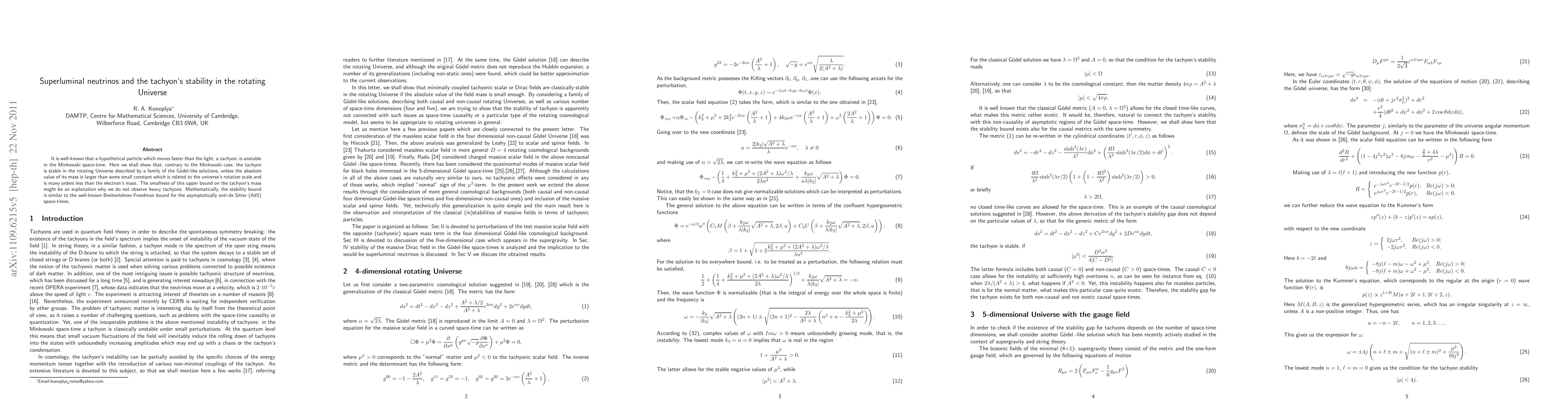 It is well-known that a hypothetical particle which moves faster than the light, a \emph{tachyon}, is unstable in the Minkowski space-time. Here we shall show that, contrary to the Minkowski case, the tachyon is stable in the rotating Universe described by a family of the G\"{o}del-like solutions, unless the absolute value of its mass is larger than some small constant which is related to the universe`s rotation scale and is many orders less than the electron`s mass. The smallness of this upper bound on the tachyon`s mass might be an explanation why we do not observe heavy tachyons. Mathematically, the stability bound is similar to the well-known Breitenlohner-Freedman bound for the asymptotically anti-de Sitter (AdS) space-times.