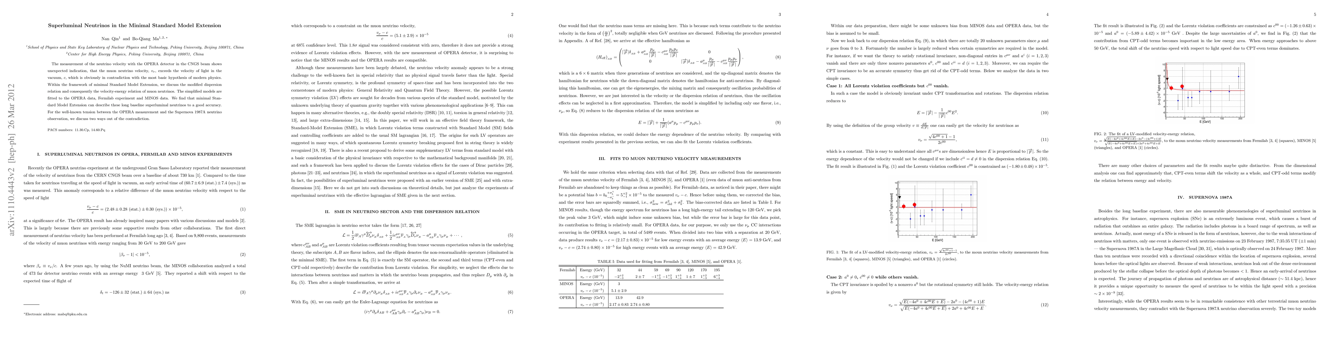 This paper explores the possibility of superluminal neutrinos in the Minimal Standard Model Extension, which could resolve contradictions between OPERA's measurement and Supernova 1987A's observation.