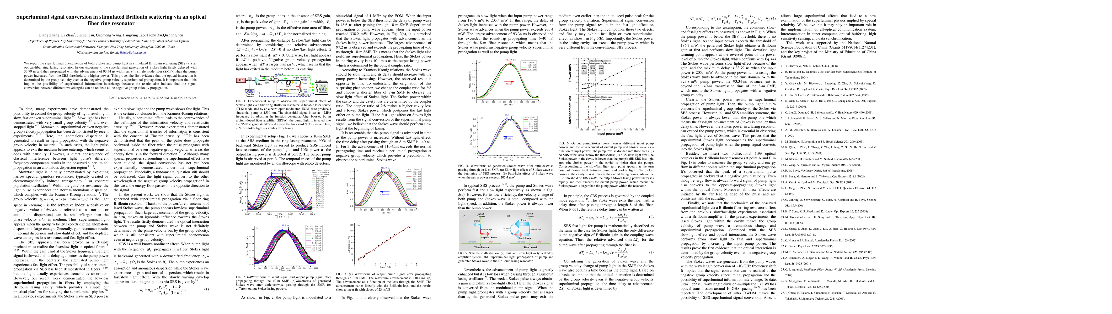 This paper reports the superluminal propagation of both Stokes and pump light in stimulated Brillouin scattering within an optical-fiber ring resonator, demonstrating a delay and subsequent advancement in signal speed. The findings suggest the potential for superluminal information interchange via signal conversion at negative group velocity.