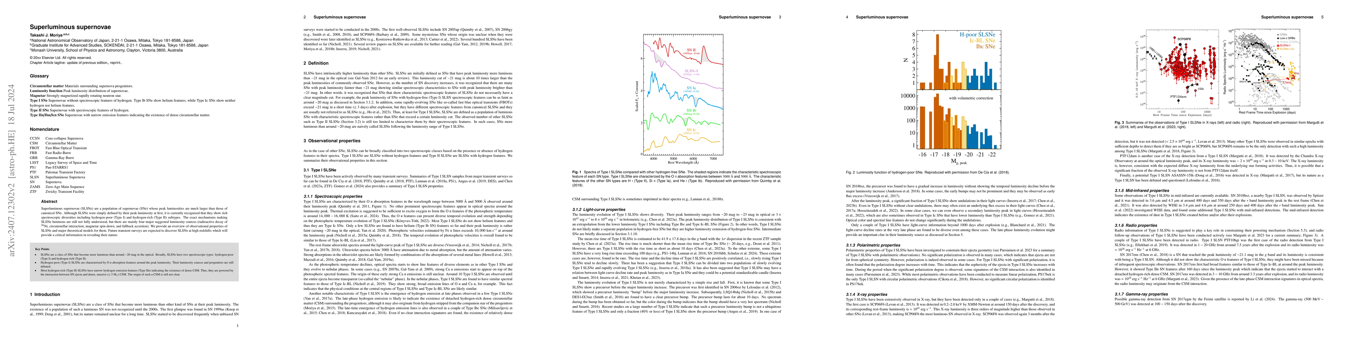 Superluminous supernovae (SLSNe) exhibit peak luminosities significantly exceeding typical supernovae, with both hydrogen-poor and rich subtypes; four main mechanisms are proposed for their luminosity: radioactive decay, circumstellar interaction, magnetar spin-down, and fallback accretion. Future surveys aim to uncover SLSNe at high redshifts to better understand their origins.