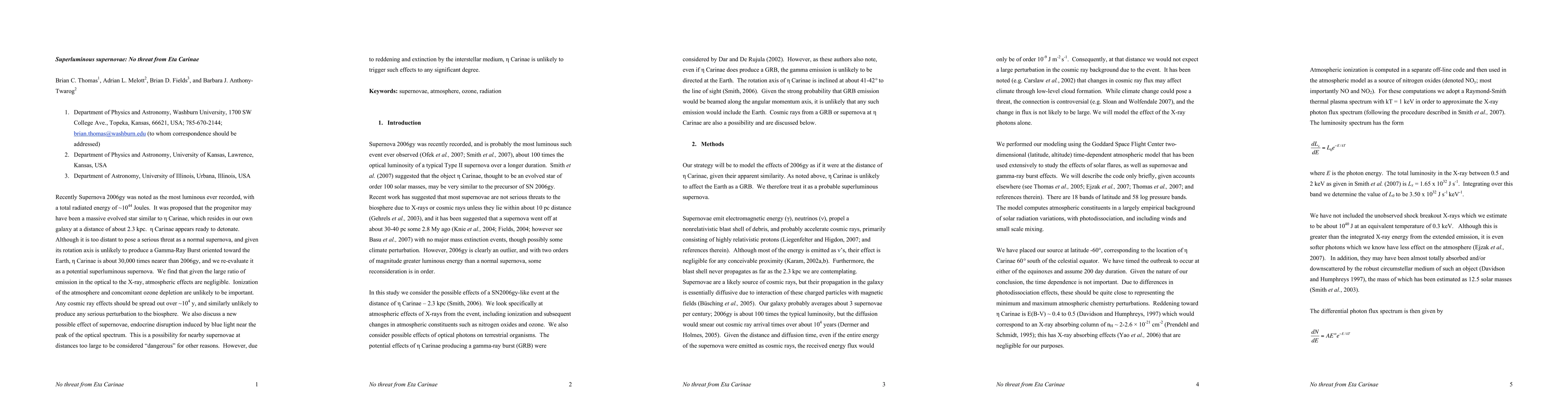 This paper evaluates the potential threat posed by Eta Carinae as a superluminous supernova, concluding that despite its proximity, it is unlikely to cause significant atmospheric or biological damage due to negligible atmospheric effects and reddening by interstellar medium. It also discusses a new potential risk of endocrine disruption from nearby supernovae, which Eta Carinae is unlikely to trigger significantly.