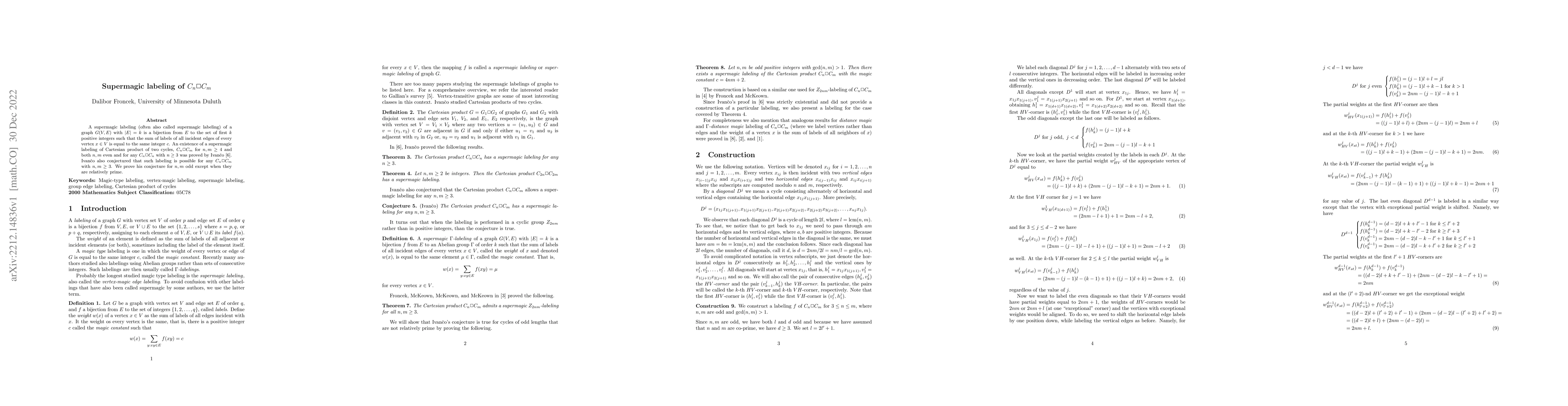 A supermagic labeling (often also called supermagic labeling) of a graph $G(V,E)$ with $|E|=k$ is a bijection from $E$ to the set of first $k$ positive integers such that the sum of labels of all incident edges of every vertex $x\in V$ is equal to the same integer $c$. An existence of a supermagic labeling of Cartesian product of two cycles, $C_{n}\Box C_m$ for $n,m\geq4$ and both $n,m$ even and for any $C_n\Box C_n$ with $n\geq3$ was proved by Ivan\v{c}o. Ivan\v{c}o also conjectured that such labeling is possible for any $C_n\Box C_m$ with $n,m\geq3$. We prove his conjecture for all $n,m$ odd that are not relatively prime.