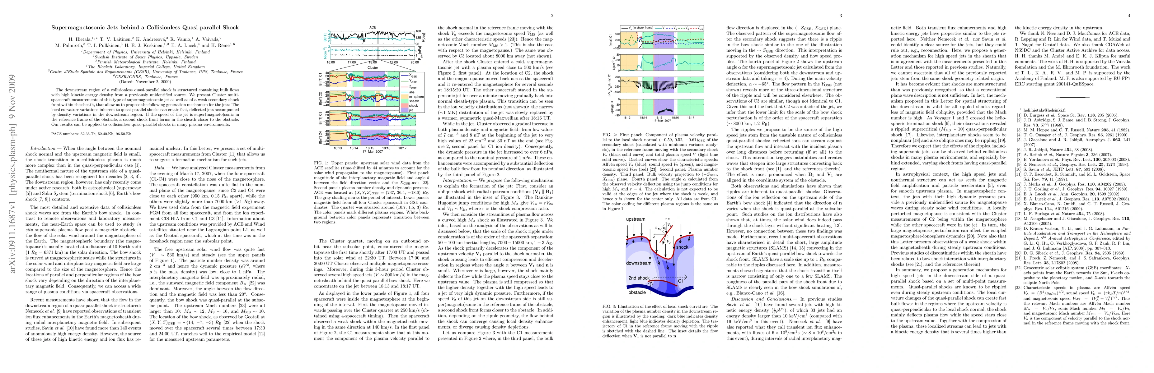 This paper reports on Cluster spacecraft measurements revealing supermagnetosonic jets behind collisionless quasi-parallel shocks, proposing that local curvature variations generate these jets, which can lead to a secondary shock formation in the sheath. These findings are relevant to various plasma environments.