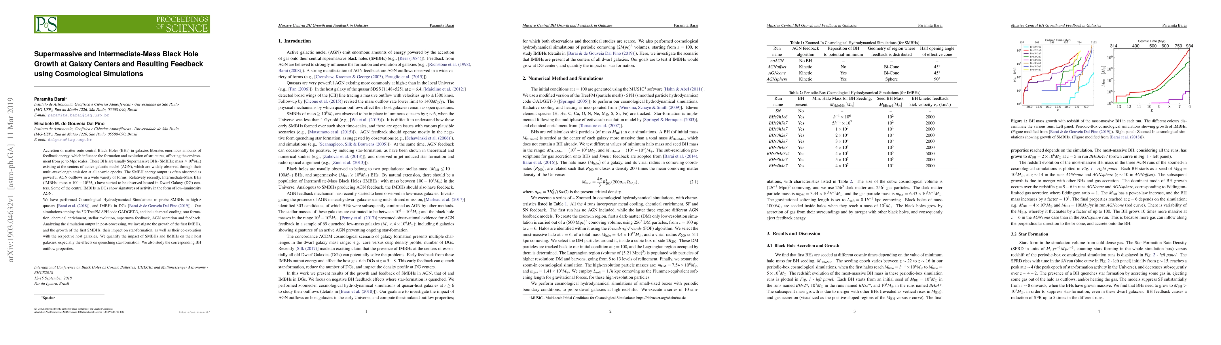 Accretion of matter onto central Black Holes (BHs) in galaxies liberates enormous amounts of feedback energy, which influence the formation and evolution of structures, affecting the environment from pc to Mpc scales. These BHs are usually Supermassive BHs (SMBHs: mass $\geq 10^6 M_{\odot}$) existing at the centers of active galactic nuclei (AGN), which are widely observed through their multi-wavelength emission at all cosmic epochs. The SMBH energy output is often observed as powerful AGN outflows in a wide variety of forms. Relatively recently, Intermediate-Mass BHs (IMBHs: mass = $100 - 10^6 M_{\odot}$) have started to be observed hosted in Dwarf Galaxy (DG) centers. Some of the central IMBHs in DGs show signatures of activity in the form of low-luminosity AGN. We have performed Cosmological Hydrodynamical Simulations to probe SMBHs in high-z quasars (Barai et al. 2018), and IMBHs in DGs (Barai & de Gouveia Dal Pino 2019). Our simulations employ the 3D TreePM SPH code GADGET-3, and include metal cooling, star formation, chemical enrichment, stellar evolution, supernova feedback, AGN accretion and feedback. Analyzing the simulation output in post-processing, we investigate the growth of the first IMBHs, and the growth of the first SMBHs, their impact on star-formation, as well as their co-evolution with the respective host galaxies. We quantify the impact of SMBHs and IMBHs on their host galaxies, especially the effects on quenching star-formation. We also study the corresponding BH outflow properties.
