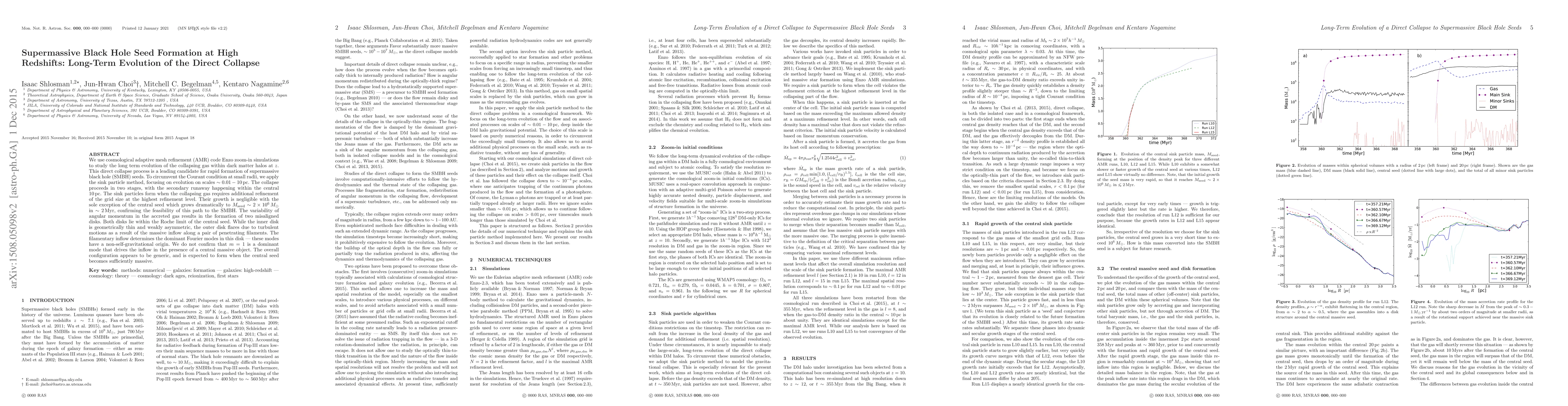 We use cosmological adaptive mesh refinement (AMR) code Enzo zoom-in simulations to study the long term evolution of the collapsing gas within dark matter (DM) halos at high redshifts. This direct collapse process is a leading candidate for rapid formation of supermassive black hole (SMBH) seeds at high z. To circumvent the Courant condition at small radii, we have used the sink particle method, and focus on the evolution on scales ~0.01-10 pc. The collapse proceeds in two stages, with the secondary runaway happening within the central 10 pc, and with no detected fragmentation. The sink particles form when the collapsing gas requires additional refinement of the grid size at the highest refinement level. Their mass never exceeds ~10^3 Mo, with the sole exception of the central seed which grows dramatically to ~ 2 x 10^6 Mo in ~2 Myr, confirming the feasibility of this path to the SMBH. The time variability of angular momentum axis in the accreted gas results in the formation of two misaligned disks --- a small inner disk, and a more massive, outer disk which is inclined by ~45^o to the inner disk. The self-gravity of these disks is heavily diluted --- both disks lie within the Roche limit of the central seed. While the inner disk is geometrically thin and weakly asymmetric, the outer disk flares due to turbulent motions as a result of the massive inflow along a pair of penetrating filaments. The geometry of inflow via filaments determines the dominant and secondary Fourier modes in this disk --- these modes have a non-self-gravitational origin. We do not confirm that m=1 is a principal mode that drives the inflow in the presence of a central massive object. While the positions of the disks depend on the scale chosen to break the self-similar collapse, the overall configuration appears to be generic, and is expected to form when the central seed becomes sufficiently massive.