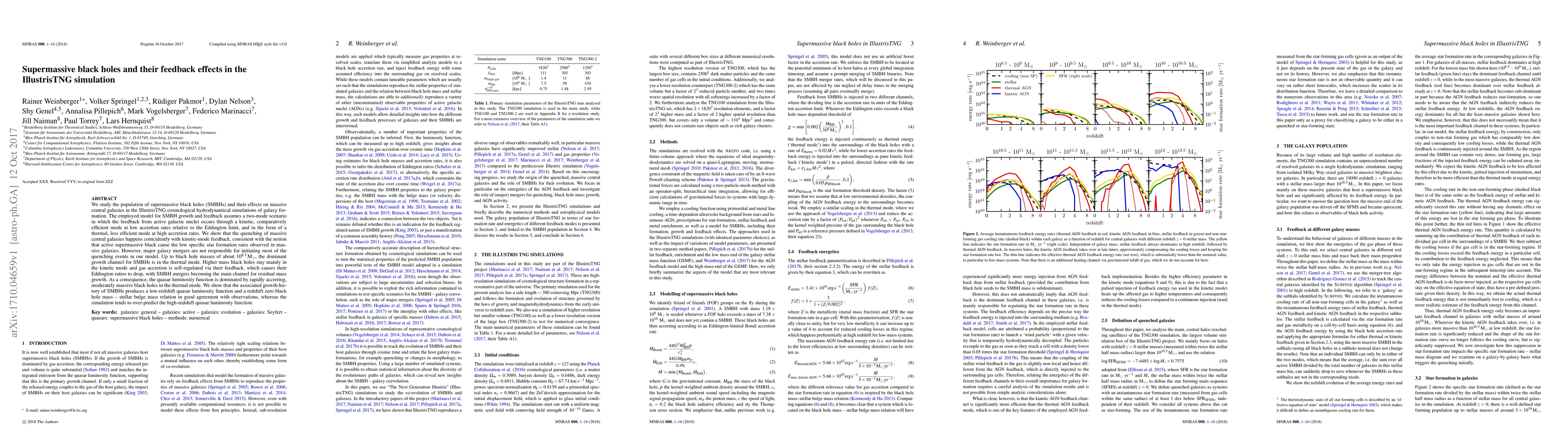 This paper investigates supermassive black holes (SMBHs) and their feedback effects in the IllustrisTNG simulation, showing that kinetic feedback at low accretion rates quenches massive central galaxies. It finds that SMBH growth is primarily thermal for lower masses and kinetic for higher masses, with mergers contributing to residual mass growth.
