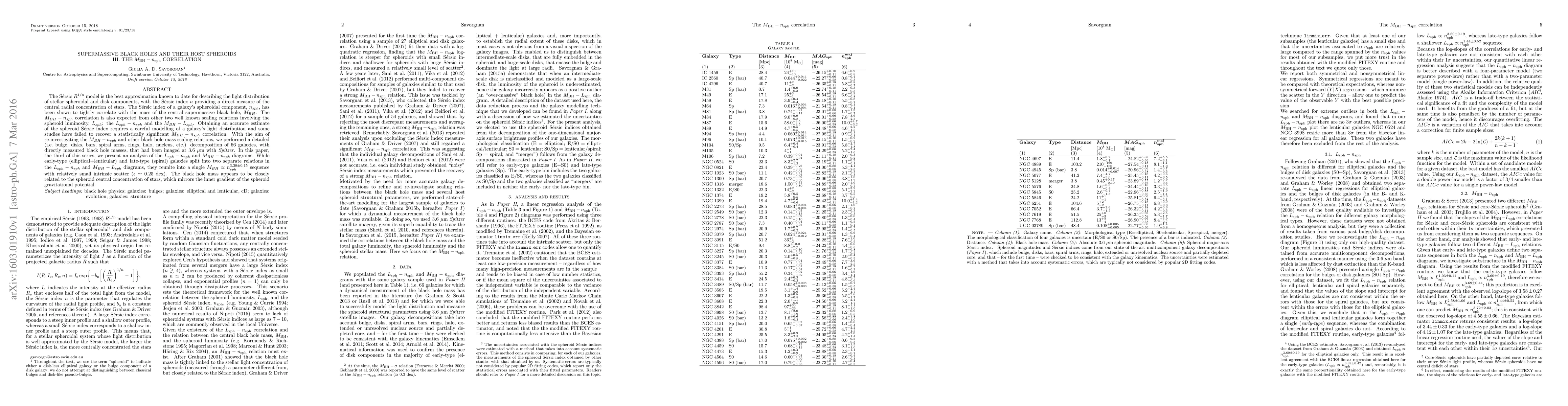 This paper investigates the correlation between the mass of supermassive black holes ($M_{BH}$) and the Sérsic index ($n_{sph}$) of their host galaxy spheroids, finding a tight $M_{BH} \propto n_{sph}^{3.39 \pm 0.15}$ relationship with minimal intrinsic scatter. The study supports the idea that black hole mass is closely tied to the central concentration of stars in the host galaxy's spheroid.