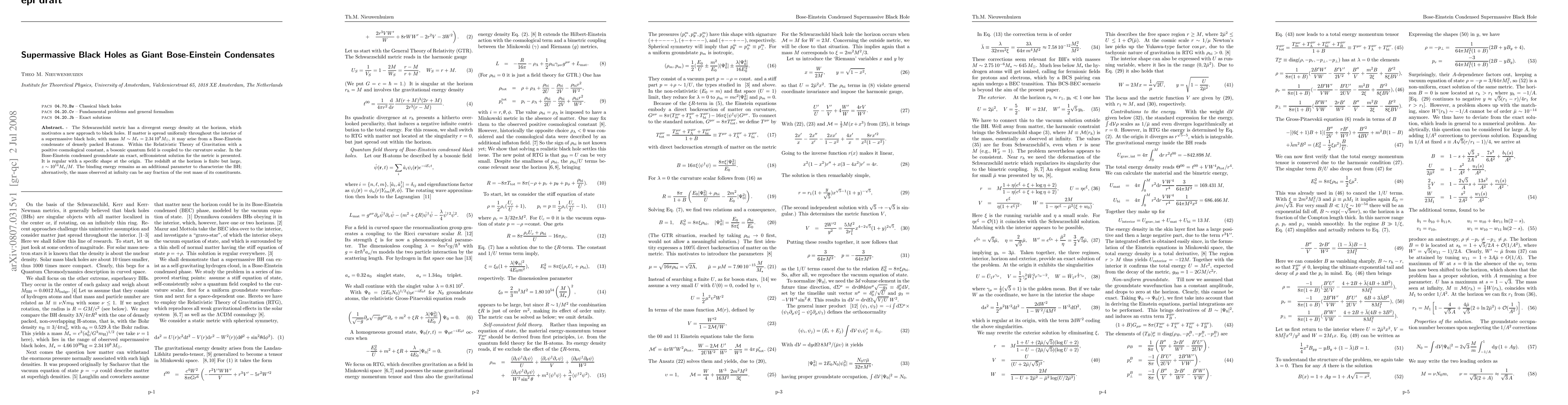 The Schwarzschild metric has a divergent energy density at the horizon, which motivates a new approach to black holes. If matter is spread uniformly throughout the interior of a supermassive black hole, with mass $M\sim M_\star= 2.34 10^8M_\odot$, it may arise from a Bose-Einstein condensate of densely packed H-atoms. Within the Relativistic Theory of Gravitation with a positive cosmological constant, a bosonic quantum field is coupled to the curvature scalar. In the Bose-Einstein condensed groundstate an exact, selfconsistent solution for the metric is presented. It is regular with a specific shape at the origin. The redshift at the horizon is finite but large, $z\sim 10^{14}$$M_\star/M$. The binding energy remains as an additional parameter to characterize the BH; alternatively, the mass observed at infinity can be any fraction of the rest mass of its constituents.
