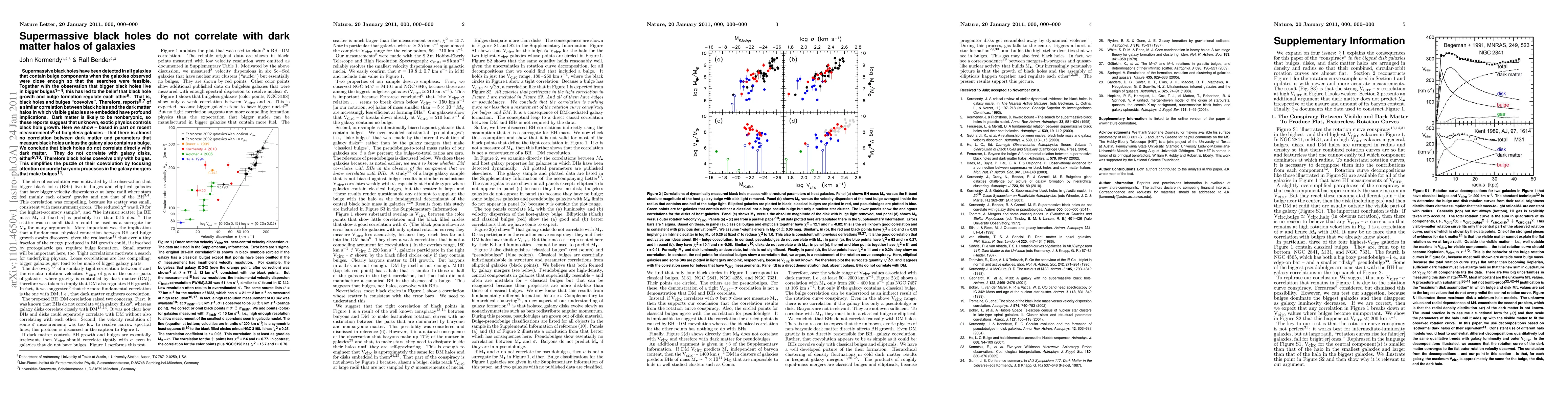 The paper presents a comprehensive analysis of galaxy rotation curves and bulge-disk-halo decompositions to demonstrate the lack of direct correlation between supermassive black holes and dark matter halos in the absence of bulges.