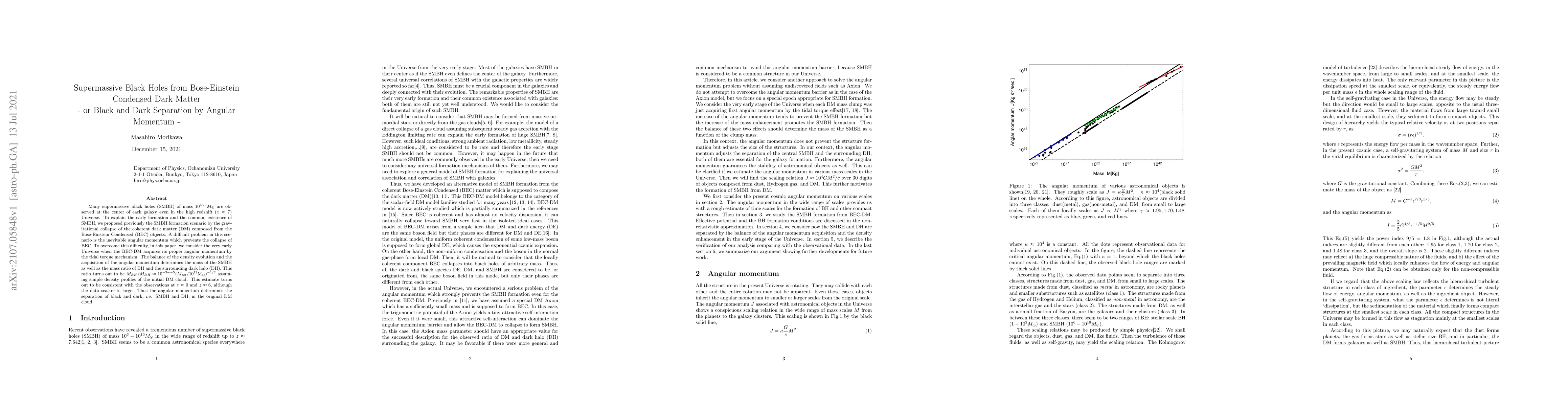 Many supermassive black holes (SMBH) of mass $10^{6\sim9}M_{\odot}$ are observed at the center of each galaxy even in the high redshift ($z\approx7$) Universe. To explain the early formation and the common existence of SMBH, we proposed previously the SMBH formation scenario by the gravitational collapse of the coherent dark matter (DM) composed from the Bose-Einstein Condensed (BEC) objects. A difficult problem in this scenario is the inevitable angular momentum which prevents the collapse of BEC. To overcome this difficulty, in this paper, we consider the very early Universe when the BEC-DM acquires its proper angular momentum by the tidal torque mechanism. The balance of the density evolution and the acquisition of the angular momentum determines the mass of the SMBH as well as the mass ratio of BH and the surrounding dark halo (DH). This ratio turns out to be $M_{BH}/M_{DH}\approx10^{-3\sim-5}(M_{tot}/10^{12}\mathrm{M}_{\odot})^{-1/2}$ assuming simple density profiles of the initial DM cloud. This estimate turns out to be consistent with the observations at $z\approx0$ and $z\approx6$, although the data scatter is large. Thus the angular momentum determines the separation of black and dark, \textsl{i.e. }SMBH and DH, in the original DM cloud.