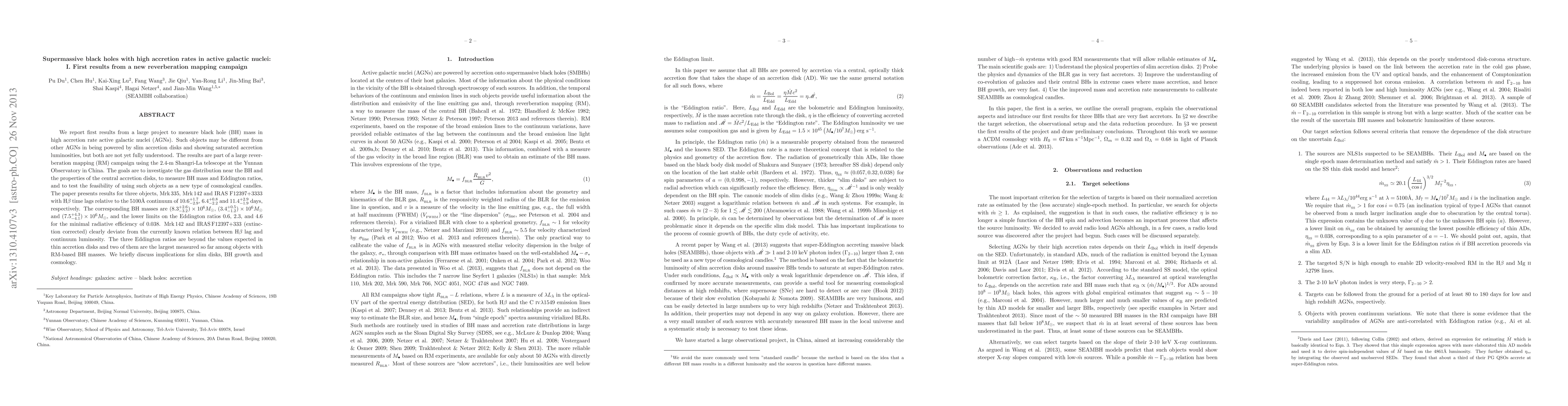 We report first results from a large project to measure black hole (BH) mass in high accretion rate active galactic nuclei (AGNs). Such objects may be different from other AGNs in being powered by slim accretion disks and showing saturated accretion luminosities, but both are not yet fully understood. The results are part of a large reverberation mapping (RM) campaign using the 2.4-m Shangri-La telescope at the Yunnan Observatory in China. The goals are to investigate the gas distribution near the BH and the properties of the central accretion disks, to measure BH mass and Eddington ratios, and to test the feasibility of using such objects as a new type of cosmological candles. The paper presents results for three objects, Mrk 335, Mrk 142 and IRAS F12397+3333 with H$\beta$ time lags relative to the 5100\AA\ continuum of $10.6^{+1.7}_{-2.9}$, $6.4^{+0.8}_{-2.2}$ and $11.4^{+2.9}_{-1.9}$ days, respectively. The corresponding BH masses are $(8.3_{-3.2}^{+2.6})\times 10^6M_{\odot}$, $(3.4_{-1.2}^{+0.5})\times 10^6M_{\odot}$ and $(7.5_{-4.1}^{+4.3})\times 10^6M_{\odot}$, and the lower limits on the Eddington ratios 0.6, 2.3, and 4.6 for the minimal radiative efficiency of 0.038. Mrk 142 and IRAS F12397+333 (extinction corrected) clearly deviate from the currently known relation between H$\beta$ lag and continuum luminosity. The three Eddington ratios are beyond the values expected in thin accretion disks and two of them are the largest measured so far among objects with RM-based BH masses. We briefly discuss implications for slim disks, BH growth and cosmology.