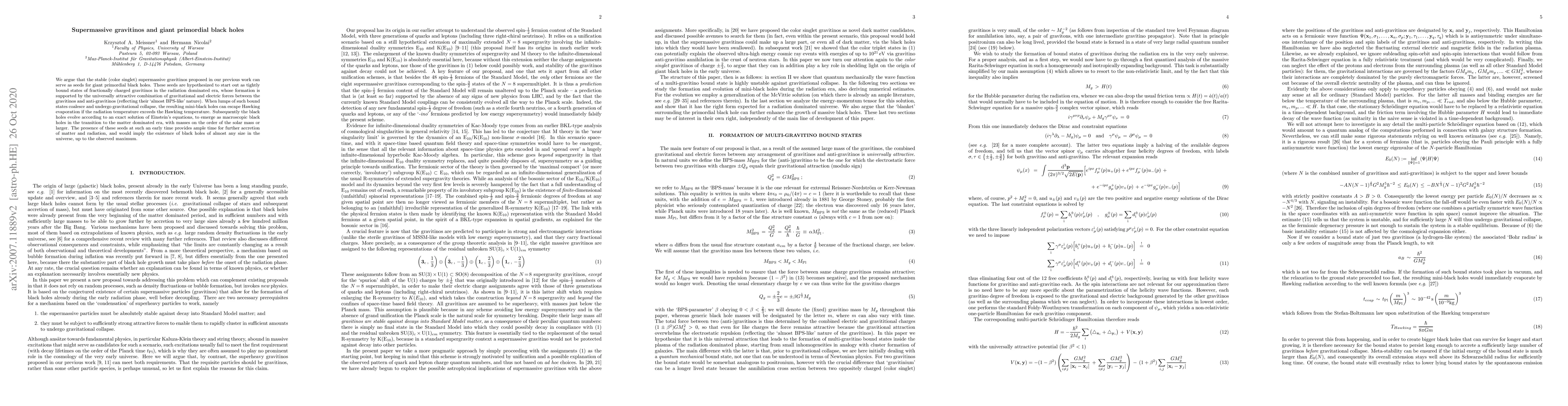 We argue that the stable (color singlet) supermassive gravitinos proposed in our previous work can serve as seeds for giant primordial black holes. These seeds are hypothesized to start out as tightly bound states of fractionally charged gravitinos in the radiation dominated era, whose formation is supported by the universally attractive combination of gravitational and electric forces between the gravitinos and anti-gravitinos (reflecting their `almost BPS-like' nature). When lumps of such bound states coalesce and undergo gravitational collapse, the resulting mini-black holes can escape Hawking evaporation if the radiation temperature exceeds the Hawking temperature. Subsequently the black holes evolve according to an exact solution of Einstein's equations, to emerge as macroscopic black holes in the transition to the matter dominated era, with masses on the order of the solar mass or larger. The presence of these seeds at such an early time provides ample time for further accretion of matter and radiation, and would imply the existence of black holes of almost any size in the universe, up to the observed maximum.