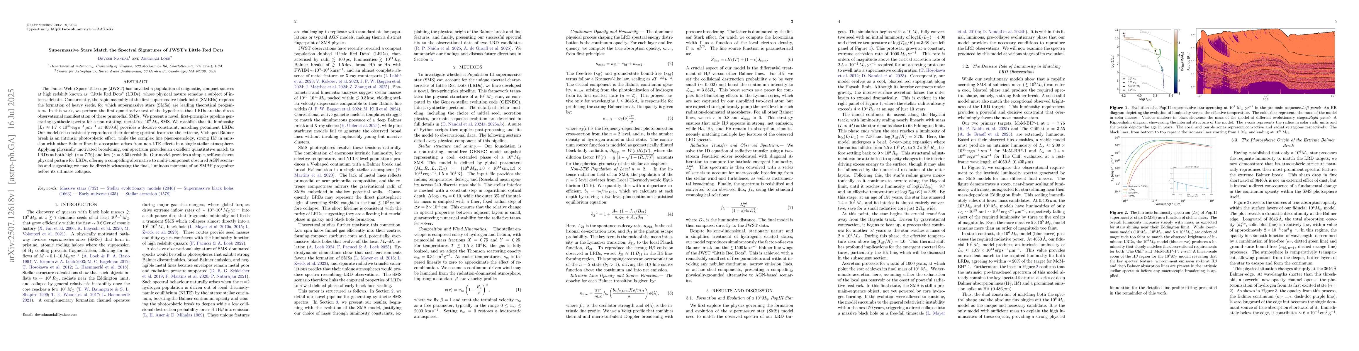 The James Webb Space Telescope (JWST) has unveiled a population of enigmatic, compact sources at high redshift known as ''Little Red Dots'' (LRDs), whose physical nature remains a subject of intense debate. Concurrently, the rapid assembly of the first supermassive black holes (SMBHs) requires the formation of heavy seeds, for which supermassive stars (SMSs) are leading theoretical progenitors. In this work, we perform the first quantitative test of the hypothesis that LRDs are the direct observational manifestation of these primordial SMSs. We present a novel, first-principles pipeline generating synthetic spectra for a non-rotating, metal-free $10^6 \, M_\odot$ SMS. We establish that its luminosity ($L_\lambda \approx 1.7 \times 10^{44} \, \text{erg} \, \text{s}^{-1} \, \mu\text{m}^{-1}$ at 4050 Angstroms) provides a decisive constraint, matching prominent LRDs. Our model self-consistently reproduces their defining spectral features: the extreme, V-shaped Balmer break is an intrinsic photospheric effect, while the complex line phenomenology, strong H$\beta$ in emission with other Balmer lines in absorption arises from non-LTE effects in a single stellar atmosphere. Applying physically motivated broadening, our spectrum provides an excellent quantitative match to LRDs at both high ($z=7.76$) and low ($z=3.55$) redshift. Our model provides a simple, self-consistent physical picture for LRDs, offering a compelling alternative to multi-component obscured AGN scenarios and suggesting we may be directly witnessing the final, luminous moments of an SMBH progenitor before its ultimate collapse.