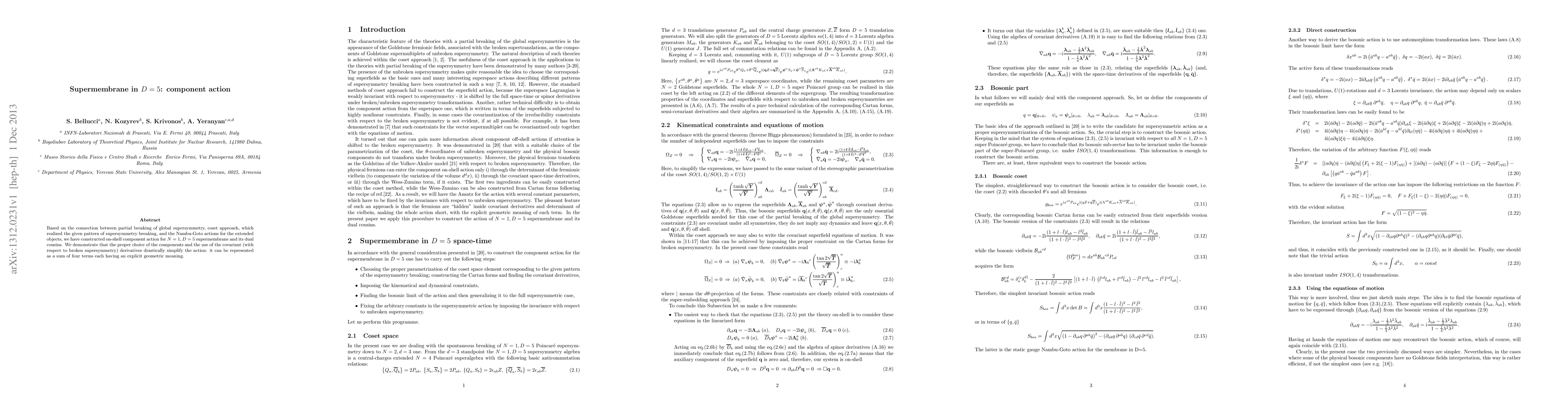 Based on the connection between partial breaking of global supersymmetry, coset approach, which realized the given pattern of supersymmetry breaking, and the Nambu-Goto actions for the extended objects, we have constructed on-shell component action for N=1, D=5 supermembrane and its dual cousins. We demonstrate that the proper choice of the components and the use of the covariant (with respect to broken supersymmetry) derivatives drastically simplify the action: it can be represented as a sum of four terms each having an explicit geometric meaning.