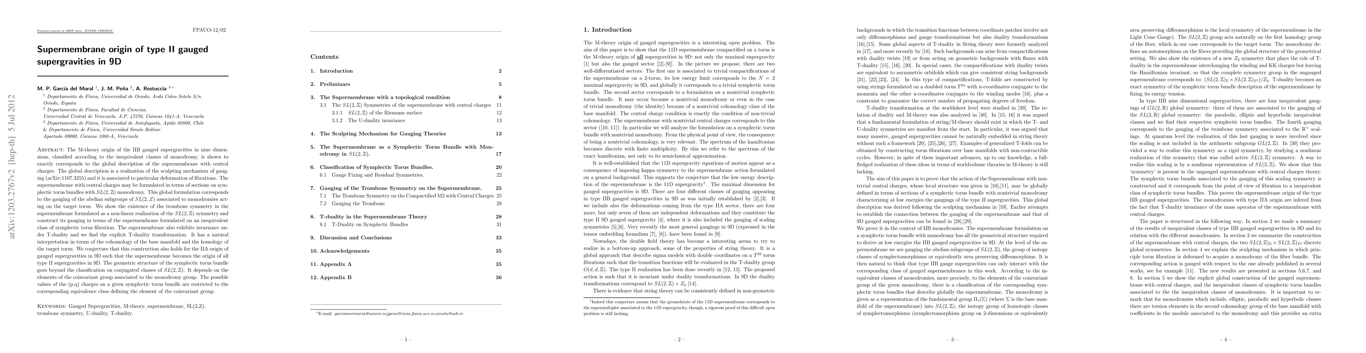The M-theory origin of the IIB gauged supergravities in nine dimensions, classified according to the inequivalent classes of monodromy, is shown to exactly corresponds to the global description of the supermembrane with central charges. The global description is a realization of the sculpting mechanism of gauging (arXiv:1107.3255) and it is associated to particular deformation of fibrations. The supermembrane with central charges may be formulated in terms of sections on symplectic torus bundles with SL(2,Z) monodromy. This global formulation corresponds to the gauging of the abelian subgroups of SL(2,Z) associated to monodromies acting on the target torus. We show the existence of the trombone symmetry in the supermembrane formulated as a non-linear realization of the SL(2,Z) symmetry and construct its gauging in terms of the supermembrane formulated on an inequivalent class of symplectic torus fibration. The supermembrane also exhibits invariance under T-duality and we find the explicit T-duality transformation. It has a natural interpretation in terms of the cohomology of the base manifold and the homology of the target torus. We conjecture that this construction also holds for the IIA origin of gauged supergravities in 9D such that the supermembrane becomes the origin of all type II supergravities in 9D. The geometric structure of the symplectic torus bundle goes beyond the classification on conjugated classes of SL(2,Z). It depends on the elements of the coinvariant group associated to the monodromy group. The possible values of the (p,q) charges on a given symplectic torus bundle are restricted to the corresponding equivalence class defining the element of the coinvariant group.