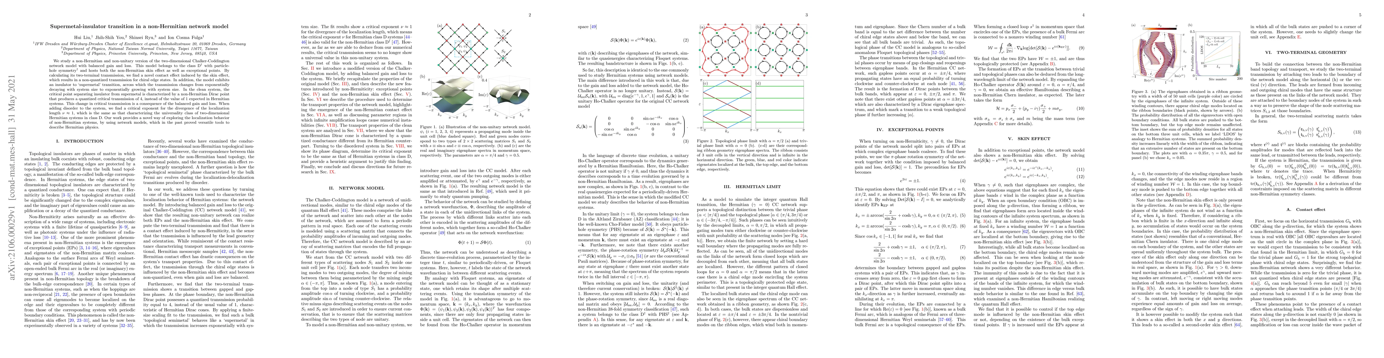 We study a non-Hermitian and non-unitary version of the two-dimensional Chalker-Coddington network model with balanced gain and loss. This model belongs to the class D^dagger with particle-hole symmetry^dagger and hosts both the non-Hermitian skin effect as well as exceptional points. By calculating its two-terminal transmission, we find a novel contact effect induced by the skin effect, which results in a non-quantized transmission for chiral edge states. In addition, the model exhibits an insulator to 'supermetal' transition, across which the transmission changes from exponentially decaying with system size to exponentially growing with system size. In the clean system, the critical point separating insulator from supermetal is characterized by a non-Hermitian Dirac point that produces a quantized critical transmission of 4, instead of the value of 1 expected in Hermitian systems. This change in critical transmission is a consequence of the balanced gain and loss. When adding disorder to the system, we find a critical exponent for the divergence of the localization length \nu \approx 1, which is the same as that characterizing the universality class of two-dimensional Hermitian systems in class D. Our work provides a novel way of exploring the localization behavior of non-Hermitian systems, by using network models, which in the past proved versatile tools to describe Hermitian physics.