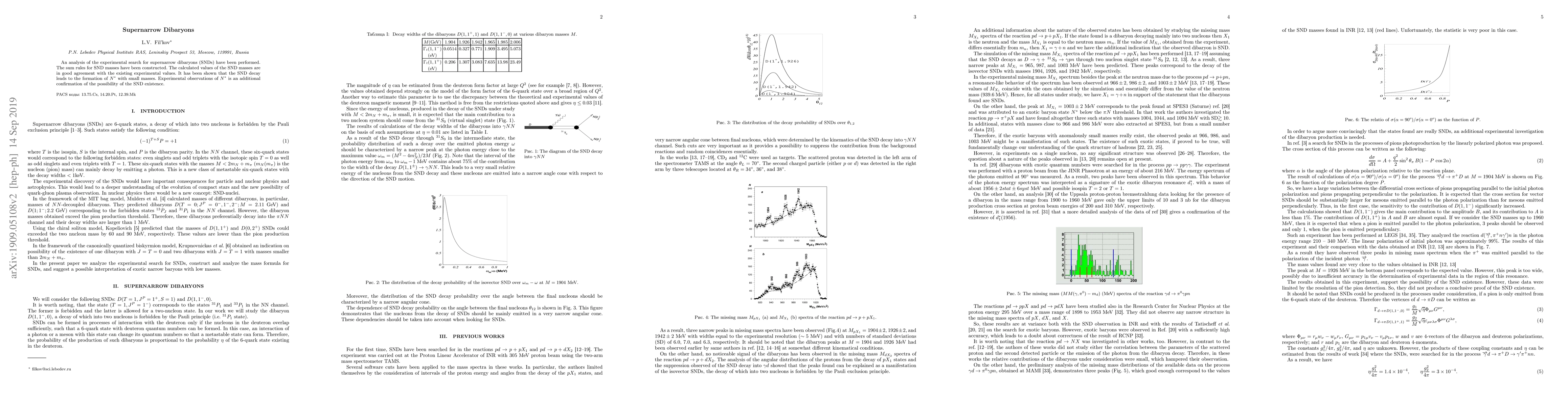 An analysis of the experimental search for supernarrow dibaryons (SNDs) have been performed. The sum rules for SND masses have been constructed. The calculated values of the SND masses are in good agreement with the existing experimental values. It has been shown that the SND decay leads to the formation of N* with small masses. Experimental observations of N* is an additional confirmation of the possibility of the SND existence.
