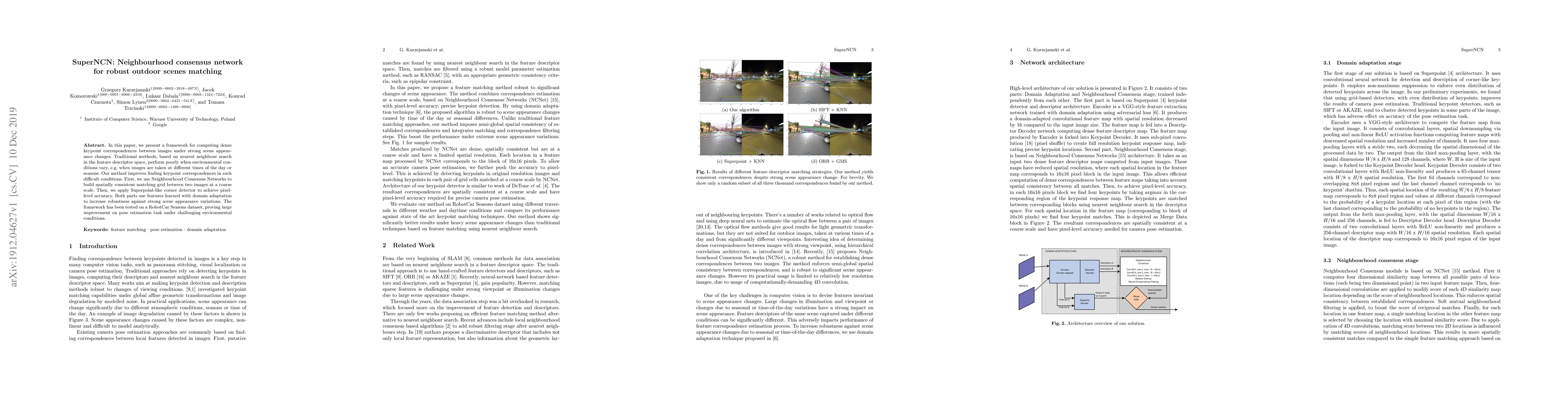 This paper introduces SuperNCN, a framework enhancing keypoint correspondence in images with significant scene appearance changes. It combines Neighbourhood Consensus Networks for coarse-scale matching and Superpoint detectors for pixel-level precision, both utilizing domain adaptation for robustness. Tested on RobotCar Seasons dataset, SuperNCN significantly improves pose estimation under varying environmental conditions.