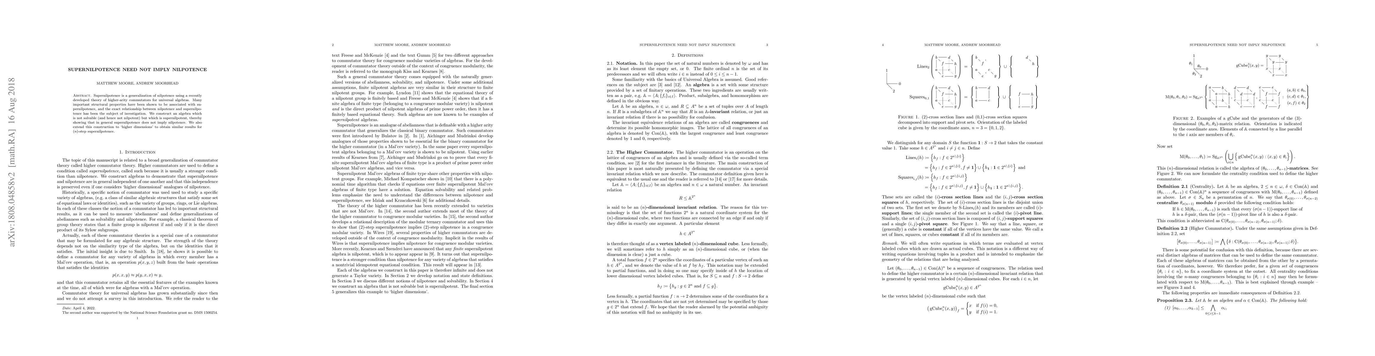 This paper demonstrates that supernilpotence does not necessarily imply nilpotence by constructing an algebra that is supernilpotent but not nilpotent. It further extends this finding to higher dimensions for $(n)$-step supernilpotence.