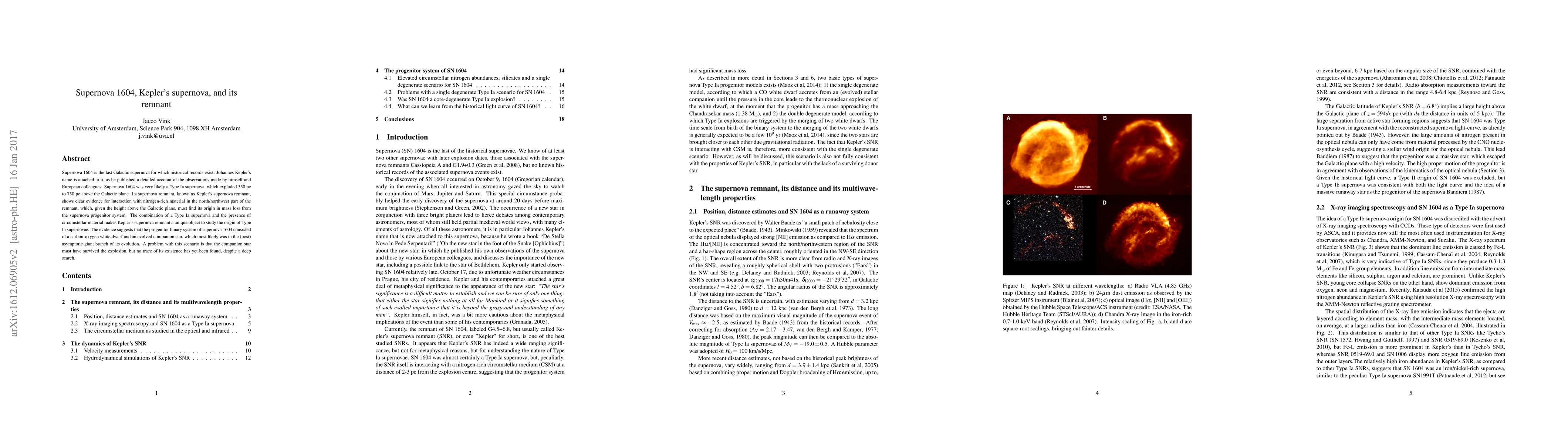 This paper investigates Supernova 1604, also known as Kepler's supernova, revealing it was likely a Type Ia event with a remnant showing interaction with nitrogen-rich material, indicative of mass loss from its progenitor system. The study highlights the unique nature of the remnant and discusses the challenges in identifying the surviving companion star from its progenitor binary system.
