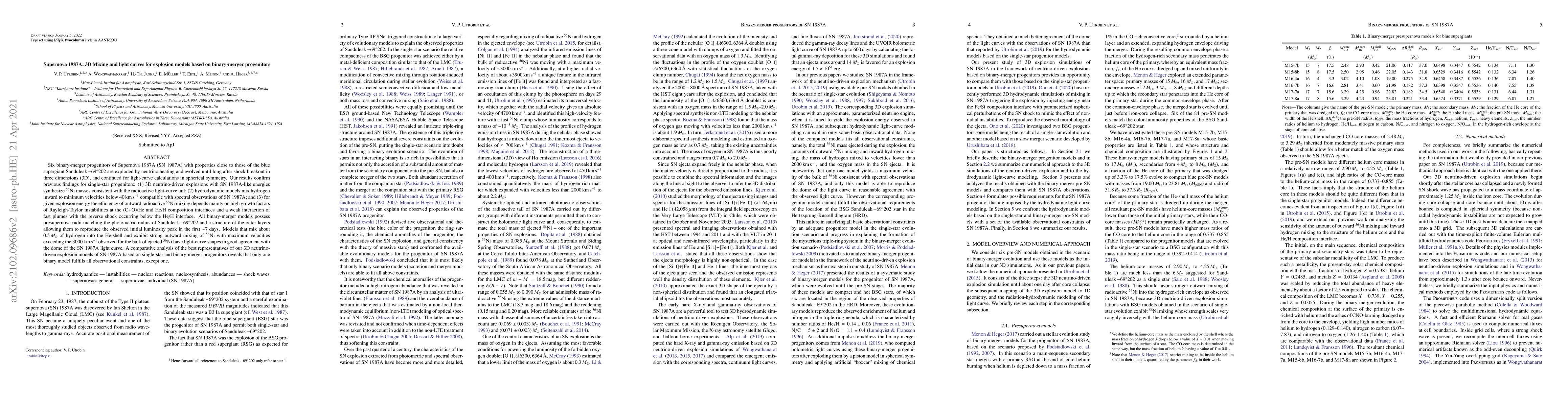 Six binary-merger progenitors of Supernova 1987A (SN 1987A) with properties close to those of the blue supergiant Sanduleak -69 202 are exploded by neutrino heating and evolved until long after shock breakout in three dimensions (3D), and continued for light-curve calculations in spherical symmetry. Our results confirm previous findings for single-star progenitors: (1) 3D neutrino-driven explosions with SN 1987A-like energies synthesize Ni-56 masses consistent with the radioactive light-curve tail; (2) hydrodynamic models mix hydrogen inward to minimum velocities below 40 km/s compatible with spectral observations of SN 1987A; and (3) for given explosion energy the efficiency of outward radioactive Ni-56 mixing depends mainly on high growth factors of Rayleigh-Taylor instabilities at the (C+O)/He and He/H composition interfaces and a weak interaction of fast plumes with the reverse shock occurring below the He/H interface. All binary-merger models possess presupernova radii matching the photometric radius of Sanduleak -69 202 and a structure of the outer layers allowing them to reproduce the observed initial luminosity peak in the first about 7 days. Models that mix about 0.5 Msun of hydrogen into the He-shell and exhibit strong outward mixing of Ni-56 with maximum velocities exceeding the 3000 km/s observed for the bulk of ejected Ni-56 have light-curve shapes in good agreement with the dome of the SN 1987A light curve. A comparative analysis of the best representatives of our 3D neutrino-driven explosion models of SN 1987A based on single-star and binary-merger progenitors reveals that only one binary model fulfills all observational constraints, except one.
