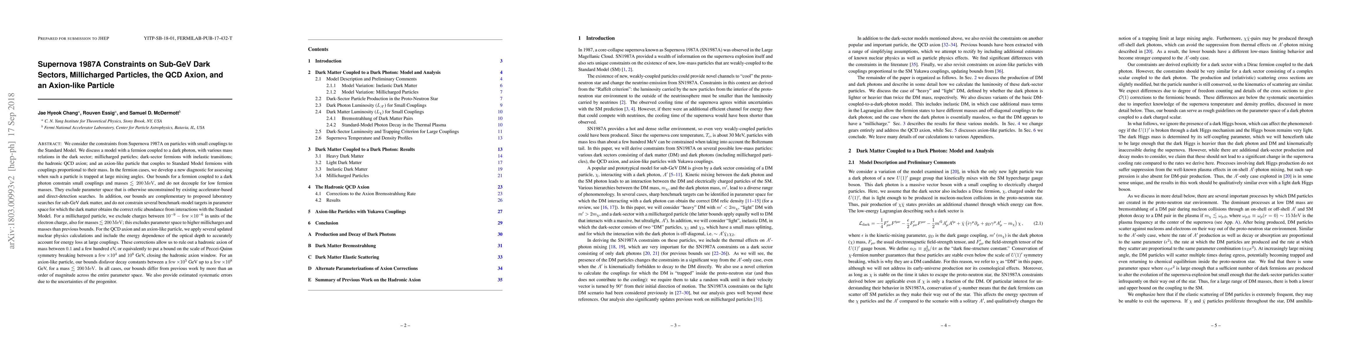 We consider the constraints from Supernova 1987A on particles with small couplings to the Standard Model. We discuss a model with a fermion coupled to a dark photon, with various mass relations in the dark sector; millicharged particles; dark-sector fermions with inelastic transitions; the hadronic QCD axion; and an axion-like particle that couples to Standard Model fermions with couplings proportional to their mass. In the fermion cases, we develop a new diagnostic for assessing when such a particle is trapped at large mixing angles. Our bounds for a fermion coupled to a dark photon constrain small couplings and masses <200 MeV, and do not decouple for low fermion masses. They exclude parameter space that is otherwise unconstrained by existing accelerator-based and direct-detection searches. In addition, our bounds are complementary to proposed laboratory searches for sub-GeV dark matter, and do not constrain several "thermal" benchmark-model targets. For a millicharged particle, we exclude charges between 10^(-9) to a few times 10^(-6) in units of the electron charge; this excludes parameter space to higher millicharges and masses than previous bounds. For the QCD axion and an axion-like particle, we apply several updated nuclear physics calculations and include the energy dependence of the optical depth to accurately account for energy loss at large couplings. We rule out a hadronic axion of mass between 0.1 and a few hundred eV, or equivalently bound the PQ scale between a few times 10^4 and 10^8 GeV, closing the hadronic axion window. For an axion-like particle, our bounds disfavor decay constants between a few times 10^5 GeV up to a few times 10^8 GeV. In all cases, our bounds differ from previous work by more than an order of magnitude across the entire parameter space. We also provide estimated systematic errors due to the uncertainties of the progenitor.
