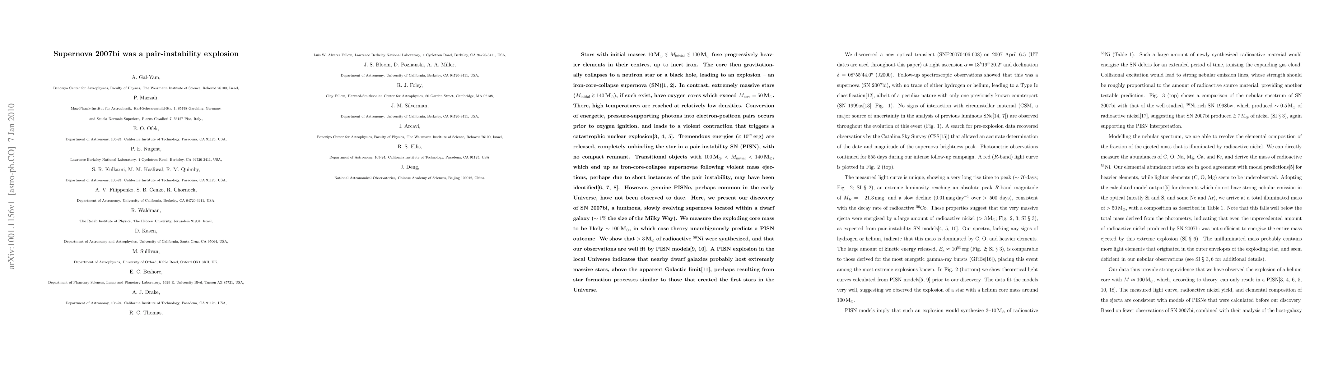 The paper reports the discovery of Supernova 2007bi as a pair-instability explosion, indicating a core mass of ~100 M_{solar} and the synthesis of >3 M_{solar} of radioactive 56Ni, consistent with pair-instability supernova models. This suggests nearby dwarf galaxies may host extremely massive stars, potentially formed through early Universe-like star formation processes.