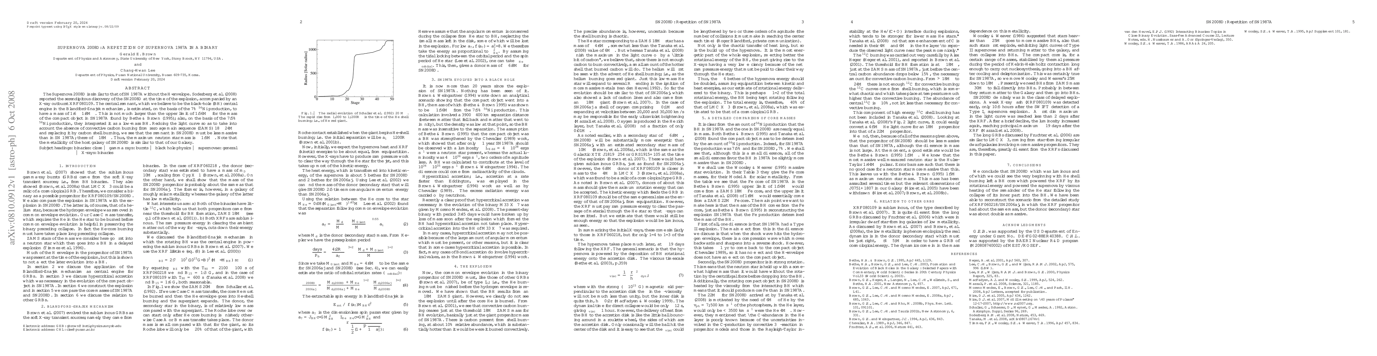 The Supernova 2008D is similar to that of SN 1987A without the H-envelope. Soderberg et al.(2008) reported the serendipitous discovery of the SN2008D at the time of the explosion, accompanied by an X-ray outburst XRF080109. The central remnant, which we believe to be the black-hole (BH) central engine in the Blandford-Znajek mechanism, is estimated, on the basis of the 7% 56Ni production, to have a mass of 1.6-1.8 M_sun. This is not much larger than the upper limit of 1.56 m_sun for the mass of the compact object in SN1987A found by Bethe & Brown (1995); also, on the basis of the 7.5% 56Ni production, they interpreted it as a low-mass BH. Redoing the light curve so as to take into account the absence of convective carbon burning from zero age main sequence 18-24 M_sun and replacing it by carbon shell burning, we see that the remnant in SN2008D must be less massive than in SN 1987A; there of 18 M_sun. Thus, the maximum neutron star mass is 1.5 M_sun. Note that the metallicity of the host galaxy of SN2008D is similar to that of our Galaxy.