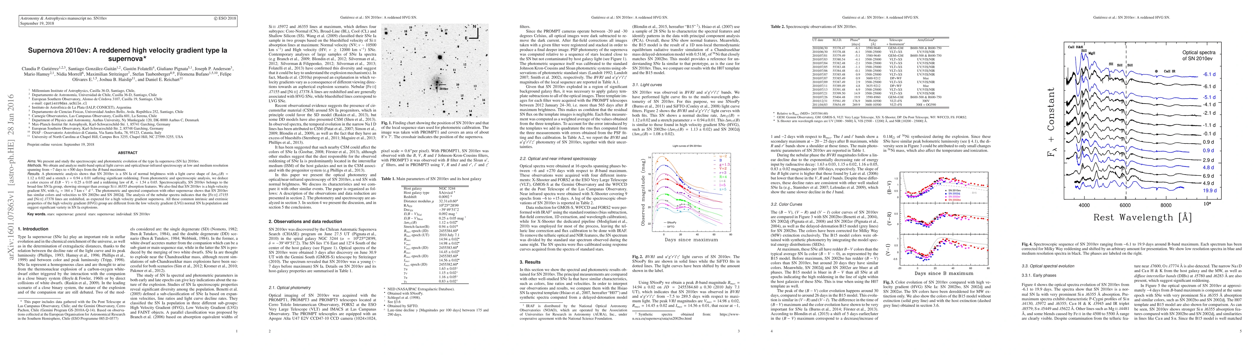 This paper studies the spectroscopic and photometric evolution of the type Ia supernova SN 2010ev, finding it to be a normal brightness SN Ia with significant reddening and a high velocity gradient. It shows strong Si II features and redshifted [Fe II] and [Ni II] lines, indicating a high velocity gradient and suggesting diversity in SN Ia explosions.