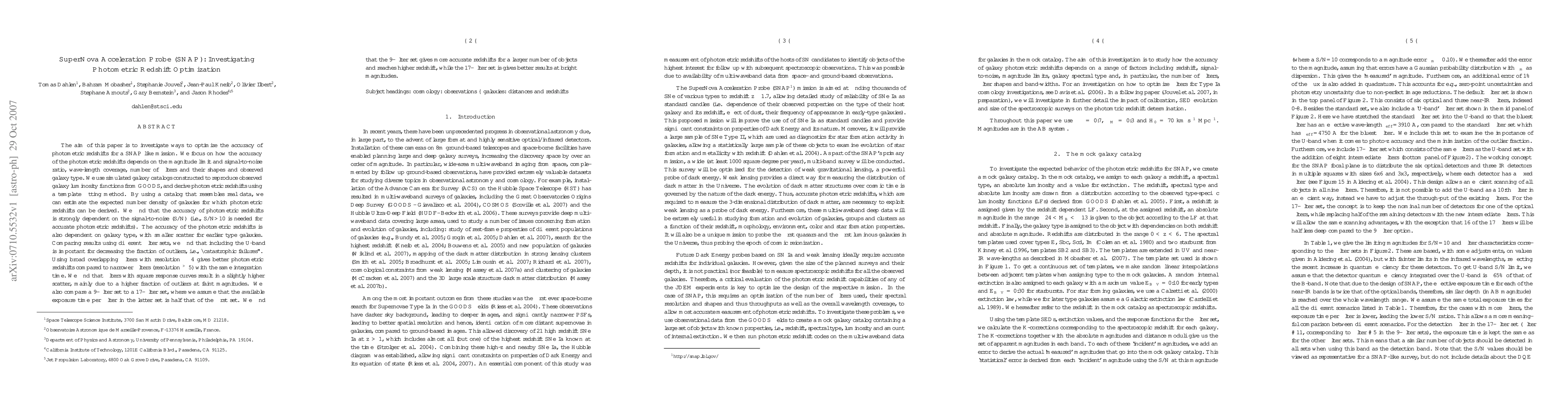 The aim of this paper is to investigate ways to optimize the accuracy of photometric redshifts for a SNAP like mission. We focus on how the accuracy of the photometric redshifts depends on the magnitude limit and signal-to-noise ratio, wave-length coverage, number of filters and their shapes and observed galaxy type. We use simulated galaxy catalogs constructed to reproduce observed galaxy luminosity functions from GOODS, and derive photometric redshifts using a template fitting method. By using a catalog that resembles real data, we can estimate the expected number density of galaxies for which photometric redshifts can be derived. We find that the accuracy of photometric redshifts is strongly dependent on the signal-to-noise (S/N) (i.e., S/N>10 is needed for accurate photometric redshifts). The accuracy of the photometric redshifts is also dependent on galaxy type, with smaller scatter for earlier type galaxies. Comparing results using different filter sets, we find that including the U-band is important for decreasing the fraction of outliers, i.e., ``catastrophic failures''. Using broad overlapping filters with resolution ~4gives better photometric redshifts compared to narrower filters (resolution >~5) with the same integration time. We find that filters with square response curves result in a slightly higher scatter, mainly due to a higher fraction of outliers at faint magnitudes. We also compare a 9-filter set to a 17-filter set, where we assume that the available exposure time per filter in the latter set is half that of the first set. We find that the 9-filter set gives more accurate redshifts for a larger number of objects and reaches higher redshift, while the 17-filter set is gives better results at bright magnitudes.