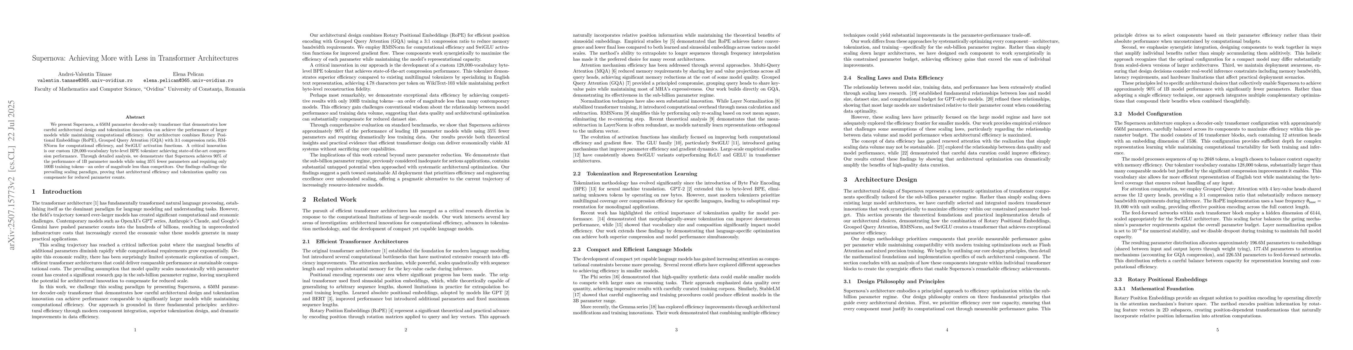 We present Supernova, a 650M-parameter decoder-only transformer that demonstrates how careful architectural design and tokenization innovation can achieve the performance of larger models while maintaining computational efficiency. Our architecture combines Rotary Positional Embeddings (RoPE), Grouped Query Attention (GQA) with a 3:1 compression ratio, RMSNorm for computational efficiency, and SwiGLU activation functions. A critical innovation is our custom 128,000-vocabulary byte-level BPE tokenizer, which achieves state-of-the-art compression performance. Through detailed analysis, we show that Supernova achieves 90% of the performance of 1B-parameter models while using 35% fewer parameters and requiring only 100B training tokens--an order of magnitude less than competing models. Our findings challenge the prevailing scaling paradigm, demonstrating that architectural efficiency and tokenization quality can compensate for reduced parameter counts.