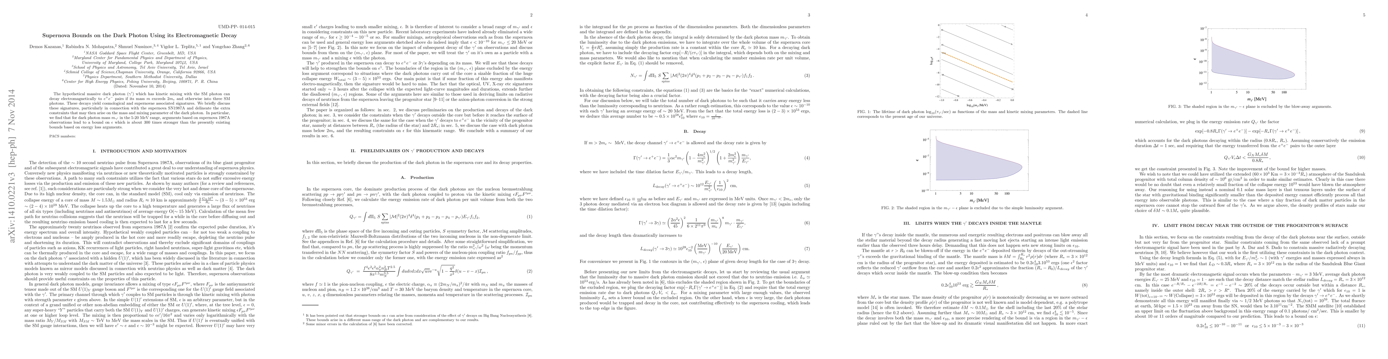 This paper explores the electromagnetic decay of the hypothetical dark photon ($\gamma'$) in the context of supernovae, particularly SN1987A, to derive stronger bounds on its mass and mixing parameter. It finds that observations from SN1987A provide constraints on the dark photon's mixing parameter $\epsilon$ that are 300 times stronger than current energy loss-based bounds for dark photon masses in the 5-20 MeV range.