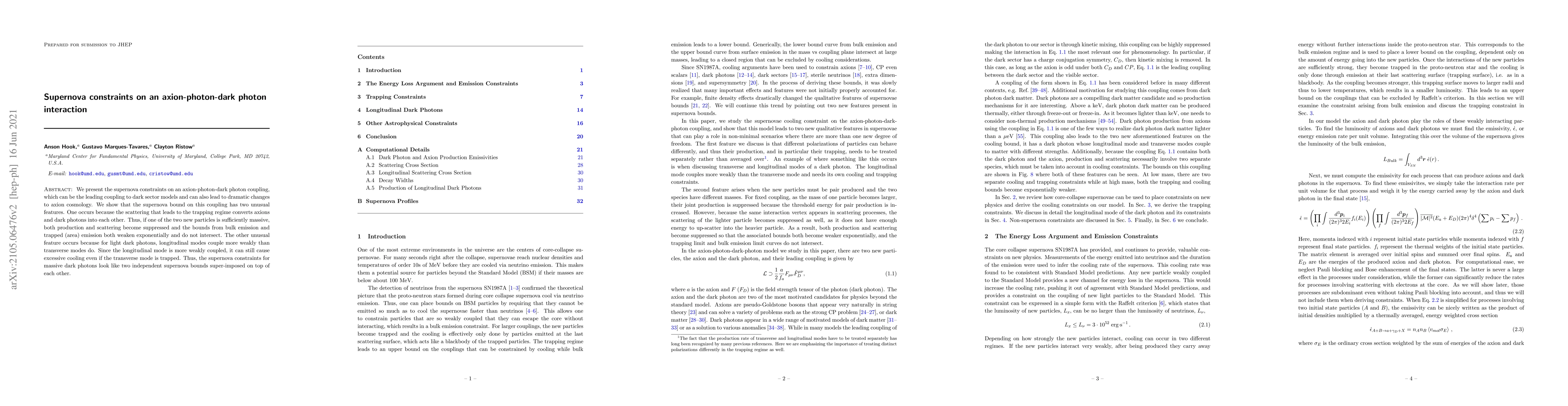 We present the supernova constraints on an axion-photon-dark photon coupling, which can be the leading coupling to dark sector models and can also lead to dramatic changes to axion cosmology. We show that the supernova bound on this coupling has two unusual features. One occurs because the scattering that leads to the trapping regime converts axions and dark photons into each other. Thus, if one of the two new particles is sufficiently massive, both production and scattering become suppressed and the bounds from bulk emission and trapped (area) emission both weaken exponentially and do not intersect. The other unusual feature occurs because for light dark photons, longitudinal modes couple more weakly than transverse modes do. Since the longitudinal mode is more weakly coupled, it can still cause excessive cooling even if the transverse mode is trapped. Thus, the supernova constraints for massive dark photons look like two independent supernova bounds super-imposed on top of each other.
