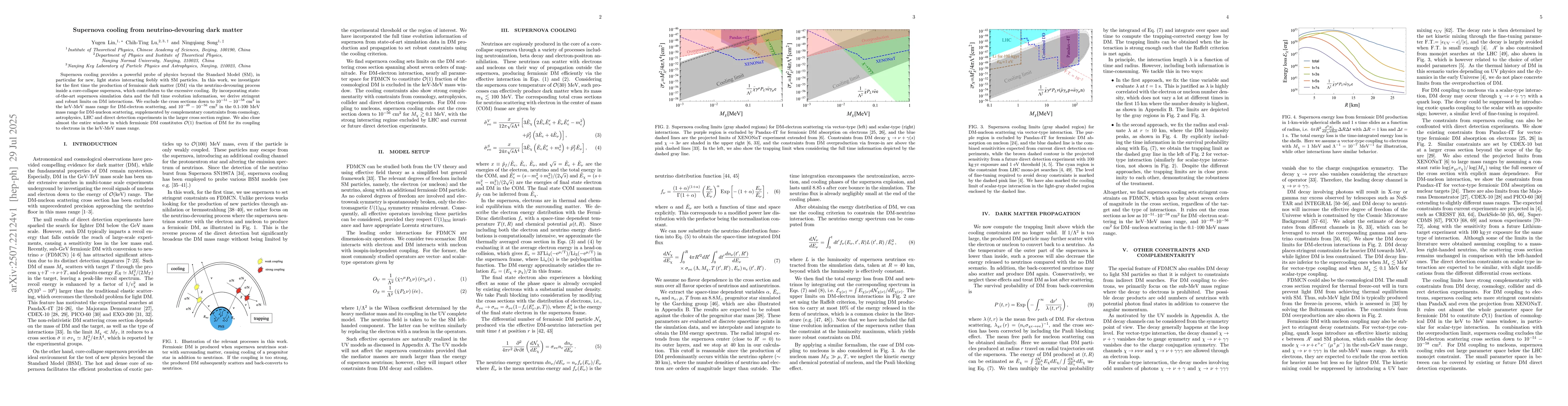 Supernova cooling provides a powerful probe of physics beyond the Standard Model (SM), in particular for new, light states interacting feebly with SM particles. In this work, we investigate for the first time the production of fermionic dark matter (DM) via the neutrino-devouring process inside a core-collapse supernova, which contributes to the excessive cooling. By incorporating state-of-the-art supernova simulation data and the full time evolution information, we derive stringent and robust limits on DM interactions. We exclude the cross sections down to $10^{-51}-10^{-58}$ cm$^2$ in the keV-MeV mass range for DM-electron scattering, and $10^{-49}-10^{-56}$ cm$^2$ in the 0.1-100 MeV mass range for DM-nucleon scattering, supplemented by complementary constraints from cosmology, astrophysics, LHC and direct detection experiments in the larger cross section regime. We also close almost the entire window in which fermionic DM constitutes $\mathcal{O}(1)$ fraction of DM for its coupling to electrons in the keV-MeV mass range.