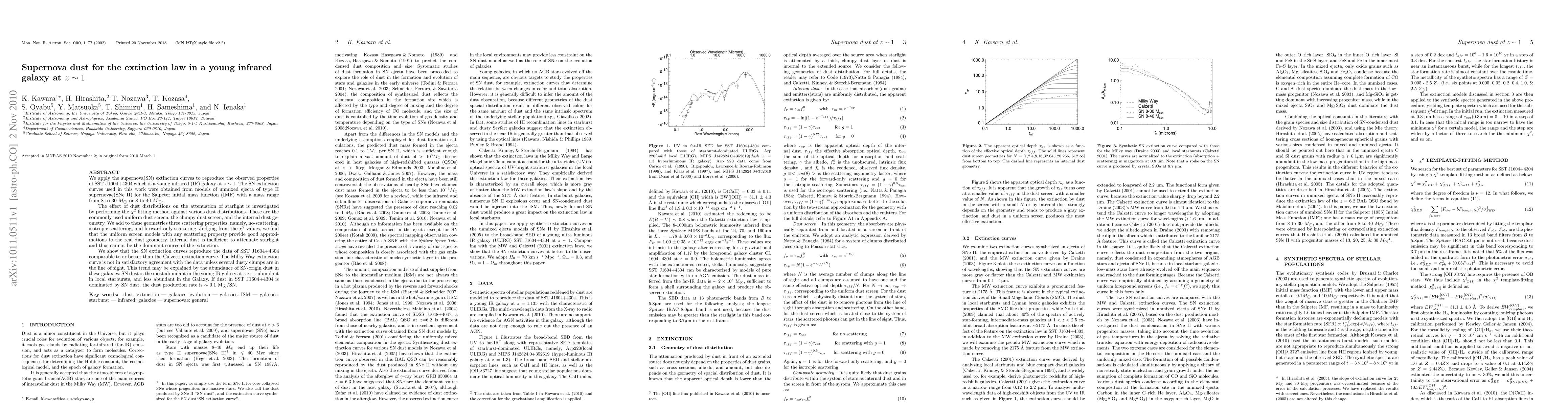 We apply the supernova(SN) extinction curves to reproduce the observed properties of SST J1604+4304 which is a young infrared (IR) galaxy at z = 1. The SN extinction curves used in this work were obtained from models of unmixed ejecta of type II supernovae(SNe II) for the Salpeter initial mass function (IMF) with a mass range from 8 to 30 M_sun or 8 to 40 M_sun. The effect of dust distributions on the attenuation of starlight is investigated by performing the chi-square fitting method against various dust distributions. These are the commonly used uniform dust screen, the clumpy dust screen, and the internal dust geometry. We add to these geometries three scattering properties, namely, no-scattering, isotropic scattering, and forward-only scattering. Judging from the chi-square values, we find that the uniform screen models with any scattering property provide good approximations to the real dust geometry. Internal dust is inefficient to attenuate starlight and thus cannot be the dominant source of the extinction. We show that the SN extinction curves reproduce the data of SST J1604+4304 comparable to or better than the Calzetti extinction curve. The Milky Way extinction curve is not in satisfactory agreement with the data unless several dusty clumps are in the line of sight. This trend may be explained by the abundance of SN-origin dust in these galaxies; SN dust is the most abundant in the young IR galaxy at z = 1, abundant in local starbursts, and less abundant in the Galaxy. If dust in SST J1604+4304 is dominated by SN dust, the dust production rate is about 0.1 M_sun per SN.