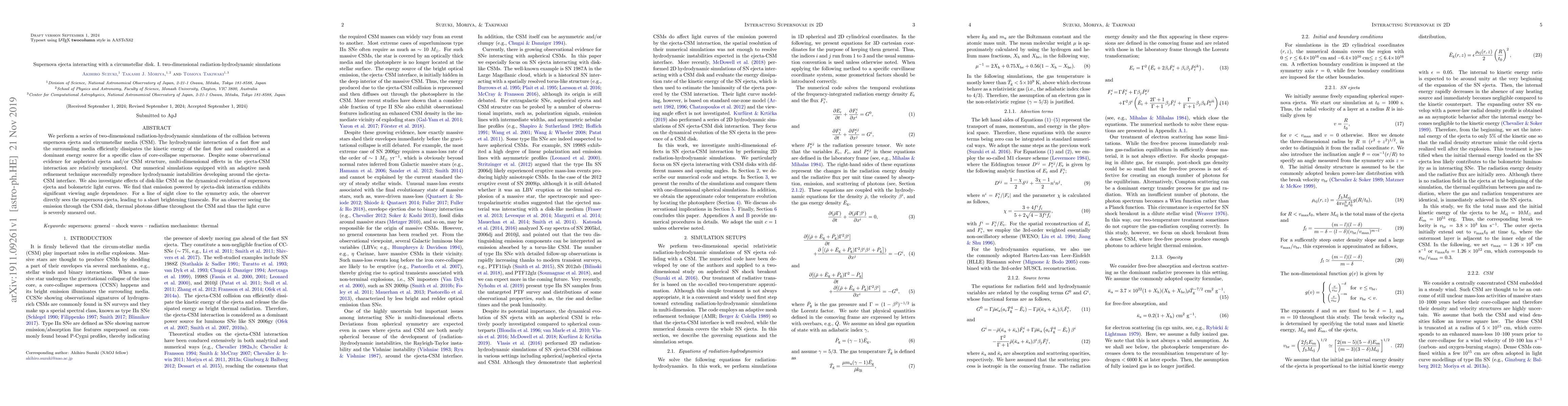This paper presents two-dimensional radiation-hydrodynamic simulations of supernova ejecta colliding with a circumstellar disk, revealing hydrodynamic instabilities and the significant viewing angle dependence of the resulting light curves. The simulations show that the interaction between ejecta and disk-like circumstellar material leads to different brightening timescales depending on the observer's perspective.