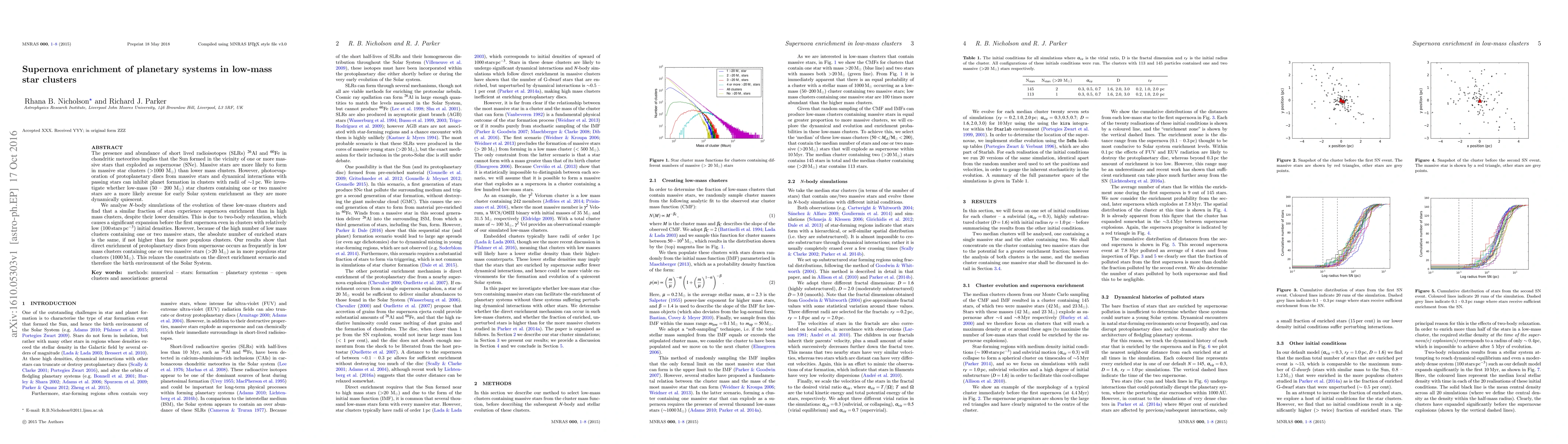 The presence and abundance of short lived radioisotopes (SLRs) $^{26}$Al and $^{60}$Fe in chondritic meteorites implies that the Sun formed in the vicinity of one or more massive stars that exploded as supernovae (SNe). Massive stars are more likely to form in massive star clusters ($>$1000 M$_{\odot}$) than lower mass clusters. However, photoevaporation of protoplanetary discs from massive stars and dynamical interactions with passing stars can inhibit planet formation in clusters with radii of $\sim$1 pc. We investigate whether low-mass (50 - 200 M$_{\odot}$) star clusters containing one or two massive stars are a more likely avenue for early Solar system enrichment as they are more dynamically quiescent. We analyse $N$-body simulations of the evolution of these low-mass clusters and find that a similar fraction of stars experience supernova enrichment than in high mass clusters, despite their lower densities. This is due to two-body relaxation, which causes a significant expansion before the first supernova even in clusters with relatively low (100 stars pc$^{-3}$) initial densities. However, because of the high number of low mass clusters containing one or two massive stars, the absolute number of enriched stars is the same, if not higher than for more populous clusters. Our results show that direct enrichment of protoplanetary discs from supernovae occurs as frequently in low mass clusters containing one or two massive stars (>20 M$_{\odot}$) as in more populous star clusters (1000 M$_\odot$). This relaxes the constraints on the direct enrichment scenario and therefore the birth environment of the Solar System.