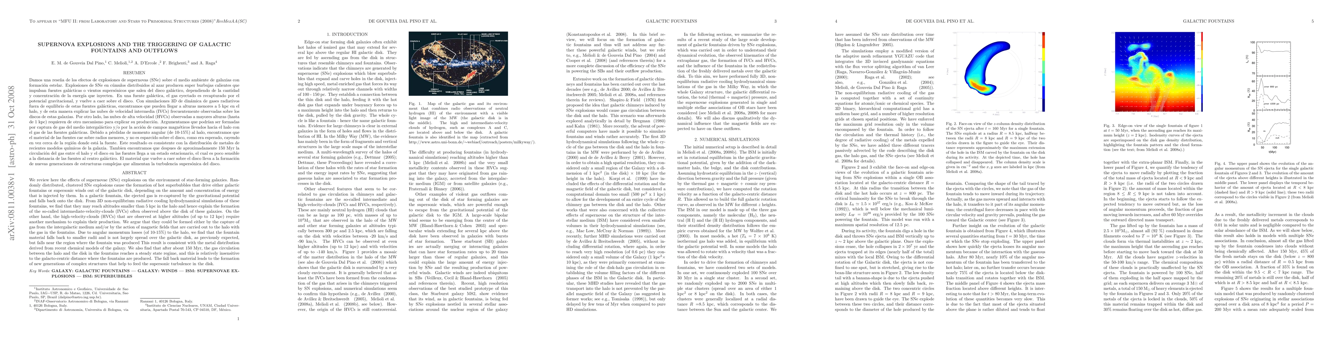 We review here the effects of supernovae (SNe) explosions on the environment of star-forming galaxies. Randomly distributed, clustered SNe explosions cause the formation of hot superbubbles that drive either galactic fountains or supersonic winds out of the galactic disk. In a galactic fountain, the ejected gas is re-captured by the gravitational potential and falls back onto the disk. From 3D non-equilibrium radiative cooling hydrodynamical simulations of these fountains, we find that they may reach altitudes smaller than 5 kpc in the halo and hence explain the formation of the so-called intermediate-velocity-clouds (IVCs). On the other hand, the high-velocity-clouds (HVCs) that are observed at higher altitudes (of up to 12 kpc) require another mechanism to explain their production. We argue that they could be formed either by the capture of gas from the intergalactic medium and/or by the action of magnetic fields that are carried out to the halo with the gas in the fountains. Due to angular momentum losses (of 10-15%) to the halo, we find that the fountain material falls back to smaller radii and is not largely spread over the galactic disk, as previously expected. This result is consistent with the metal distribution derived from recent chemical models of the galaxy. We also find that after about 150 Myr, the gas circulation between the halo and the disk in the fountains reaches a steady state regime (abridged).