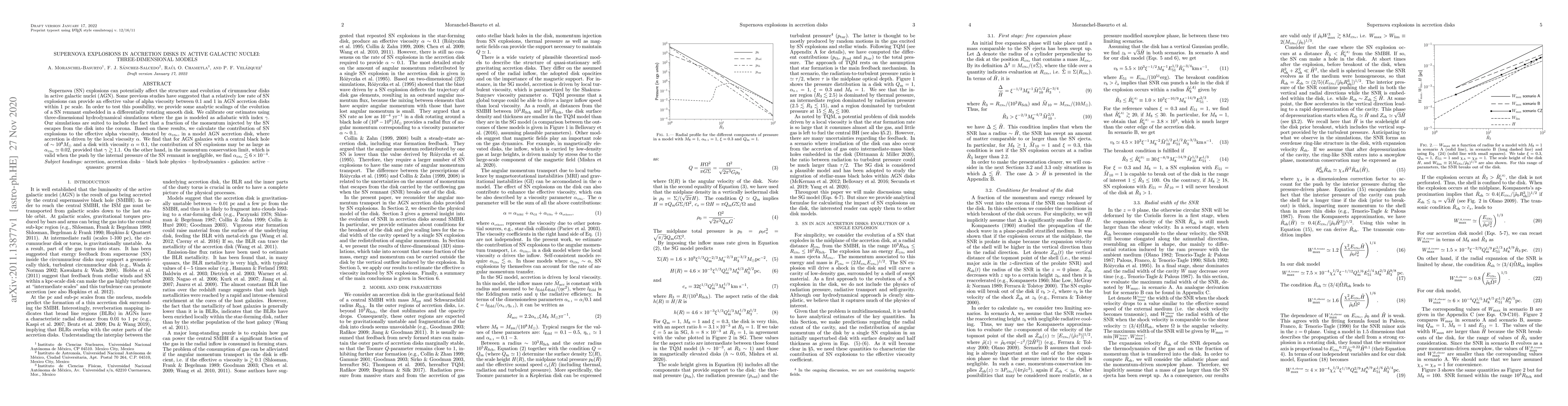 Supernova (SN) explosions can potentially affect the structure and evolution of circumnuclear disks in active galactic nuclei (AGN). Some previous studies have suggested that a relatively low rate of SN explosions can provide an effective value of alpha viscosity between 0.1 and 1 in AGN accretion disks within 1 pc scale. In order to test this possibility, we provide some analytic scalings of the evolution of a SN remnant embedded in a differentially rotating smooth disk. We calibrate our estimates using three-dimensional hydrodynamical simulations where the gas is modeled as adiabatic with index $\gamma$. Our simulations are suited to include the fact that a fraction of the momentum injected by the SN escapes from the disk into the corona. Based on these results, we calculate the contribution of SN explosions to the effective alpha viscosity, denoted by $\alpha_{SNe}$, in a model AGN accretion disk, where accretion is driven by the local viscosity $\alpha$. We find that for AGN galaxies with a central black hole of $~ 10^8M_{\cdot}$ and a disk with viscosity $\alpha=0.1$, the contribution of SN explosions may be as large as $\alpha_{SNe} \simeq 0.02$, provided that $\alpha \gtrsim 1.1$. On the other hand, in the momentum conservation limit, which is valid when the push by the internal pressure of the SN remnant is negligible, we find $\alpha_SNe \lesssim 6\times10^{-4}$.