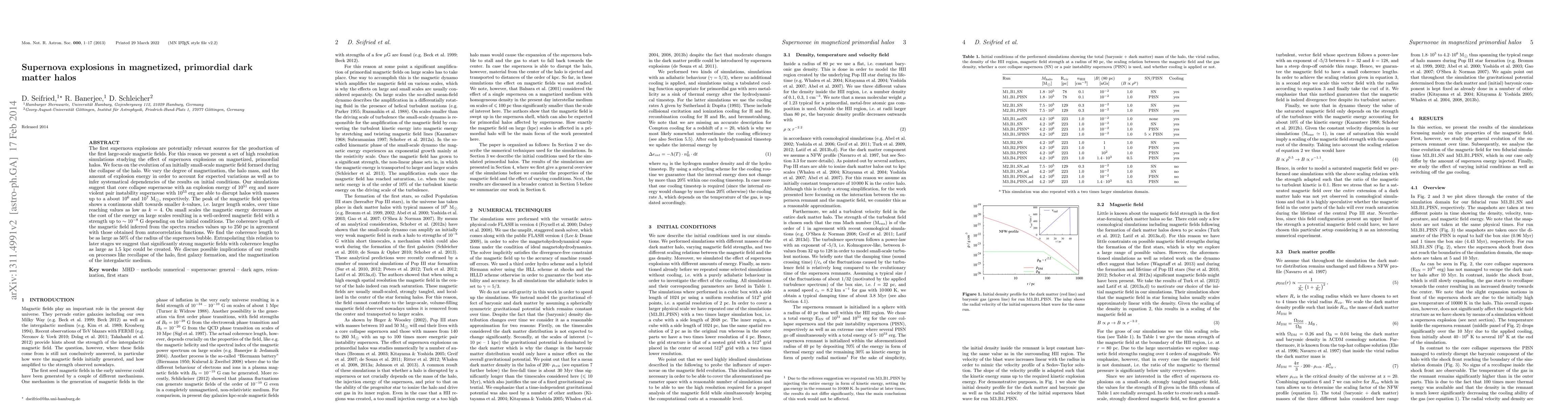 The first supernova explosions are potentially relevant sources for the production of the first large-scale magnetic fields. For this reason we present a set of high resolution simulations studying the effect of supernova explosions on magnetized, primordial halos. We focus on the evolution of an initially small-scale magnetic field formed during the collapse of the halo. We vary the degree of magnetization, the halo mass, and the amount of explosion energy in order to account for expected variations as well as to infer systematical dependencies of the results on initial conditions. Our simulations suggest that core collapse supernovae with an explosion energy of 10^51 erg and more violent pair instability supernovae with 10^53 erg are able to disrupt halos with masses up to a about 10^6 and 10^7 M_sun, respectively. The peak of the magnetic field spectra shows a continuous shift towards smaller k-values, i.e. larger length scales, over time reaching values as low as k = 4. On small scales the magnetic energy decreases at the cost of the energy on large scales resulting in a well-ordered magnetic field with a strength up to ~ 10^-8 G depending on the initial conditions. The coherence length of the magnetic field inferred from the spectra reaches values up to 250 pc in agreement with those obtained from autocorrelation functions. We find the coherence length to be as large as $50\%$ of the radius of the supernova bubble. Extrapolating this relation to later stages we suggest that significantly strong magnetic fields with coherence lengths as large as 1.5 kpc could be created. We discuss possible implications of our results on processes like recollapse of the halo, first galaxy formation, and the magnetization of the intergalactic medium.