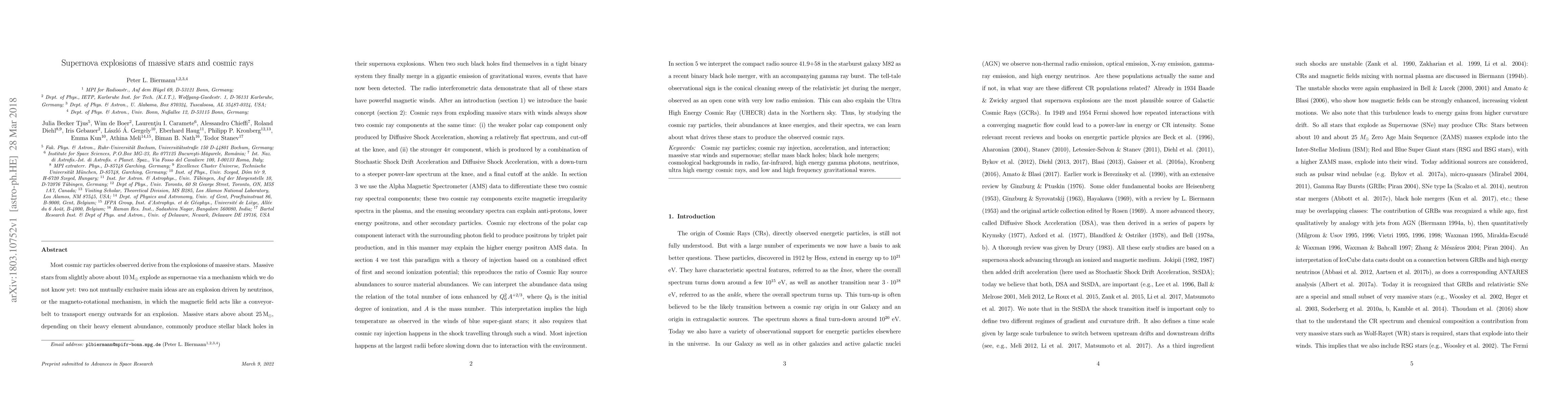 Most cosmic ray particles observed derive from the explosions of massive stars, which commonly produce stellar black holes in their supernova explosions. When two such black holes find themselves in a tight binary system they finally merge in a gigantic emission of gravitational waves, events that have now been detected. After an introduction (section 1) we introduce the basic concept (section 2): Cosmic rays from exploding massive stars with winds always show two cosmic ray components at the same time: (i) the weaker polar cap component only produced by Diffusive Shock Acceleration with a cut-off at the knee, and (ii) the stronger $4 \pi$ component with a down-turn to a steeper power-law spectrum at the knee, and a final cutoff at the ankle. In section 3 we use the Alpha Magnetic Spectrometer (AMS) data to differentiate these two cosmic ray spectral components. The ensuing secondary spectra can explain anti-protons, lower energy positrons, and other secondary particles. Triplet pair production may explain the higher energy positron AMS data. In section 4 we test this paradigm with a theory of injection based on a combined effect of first and second ionization potential; this reproduces the ratio of Cosmic Ray source abundances to source material abundances. In section 5 we interpret the compact radio source 41.9+58 in the starburst galaxy M82 as a recent binary black hole merger, with an accompanying gamma ray burst. This can also explain the Ultra High Energy Cosmic Ray (UHECR) data in the Northern sky. Thus, by studying the cosmic ray particles, their abundances at knee energies, and their spectra, we can learn about what drives these stars to produce the observed cosmic rays.