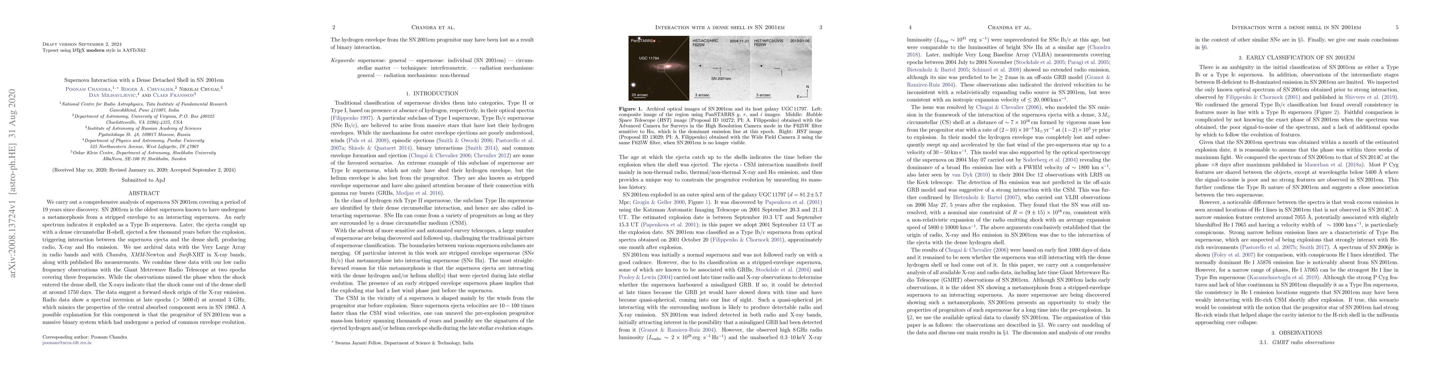This paper analyzes SN 2001em, a supernova that transitioned from a stripped-envelope to an interacting supernova after encountering a dense circumstellar hydrogen shell. Observations reveal radio, X-ray, and H$\alpha$ emissions resulting from the interaction, suggesting the progenitor was likely a massive binary system.