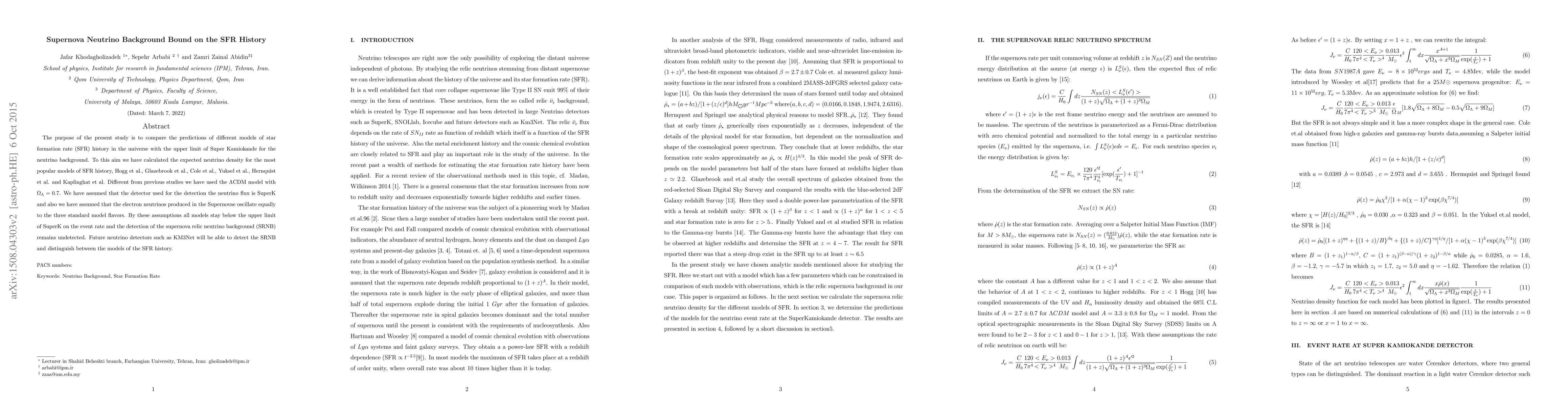The purpose of the present study is to compare the predictions of different models of star formation rate (SFR) history in the universe with the upper limit of Super Kamiokande for the neutrino background. To this aim we have calculated the expected neutrino density for the most popular models of SFR history, Hogg et al. ,Glazebrook et al., Cole et al., Yuksel et al., Hernquist et al. and Kaplinghat et al. Differerent from previous studies we have used the $\Lambda$CDM model with $\Omega_{\Lambda} = 0.7$. We have assumed that the detector used for the detection the neutrino flux is SuperK and also we have assumed that the electron neutrinos produced in the Supernovae oscillate equally to the three standard model flavors. By these assumptions all models stay below the upper limit of SuperK on the event rate and the detection of the supernova relic neutrino background (SRNB) remains undetected. Future neutrino detectors such as KM3Net will be able to detect the SRNB and distinguish between the models of the SFR history.